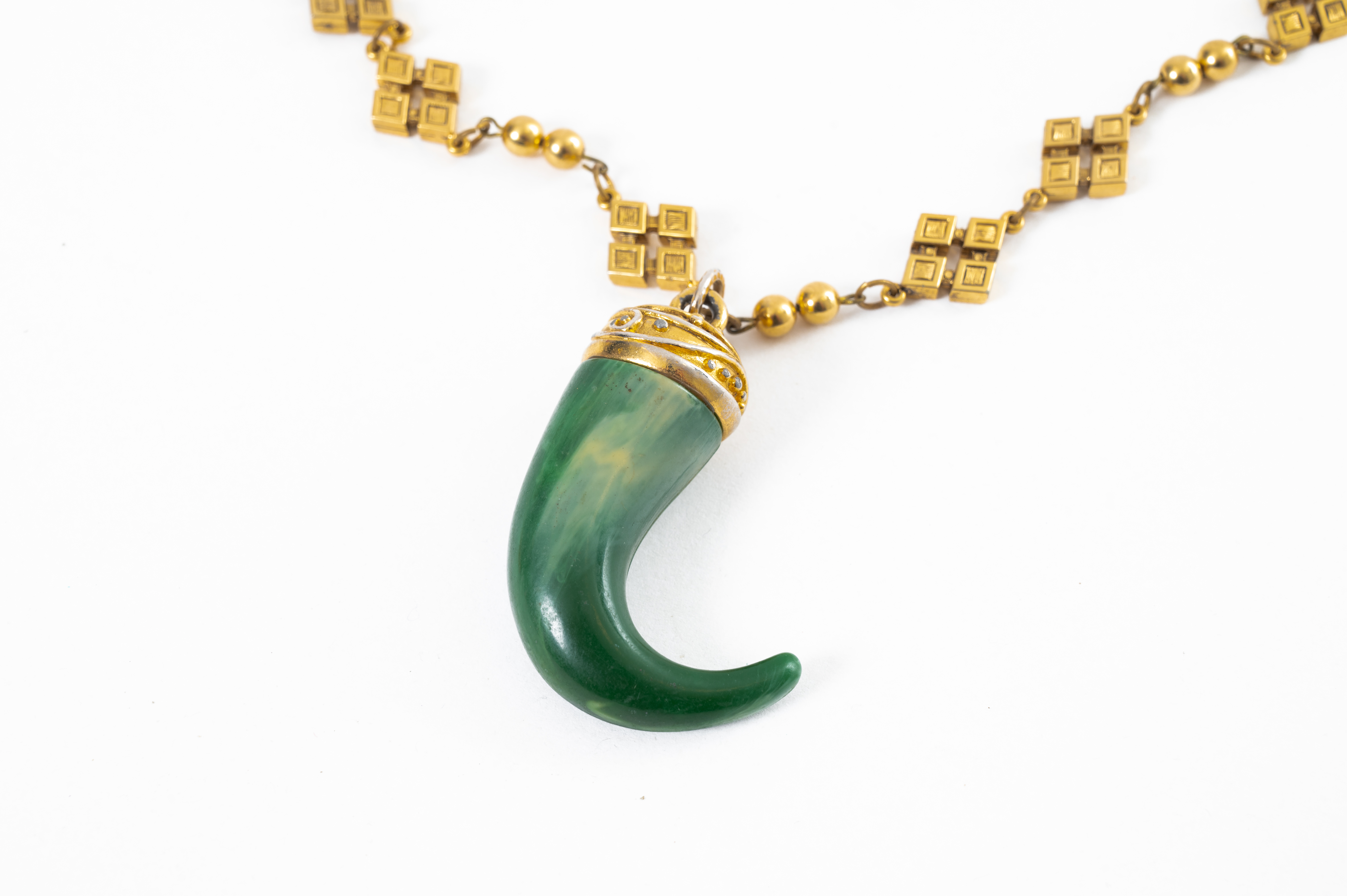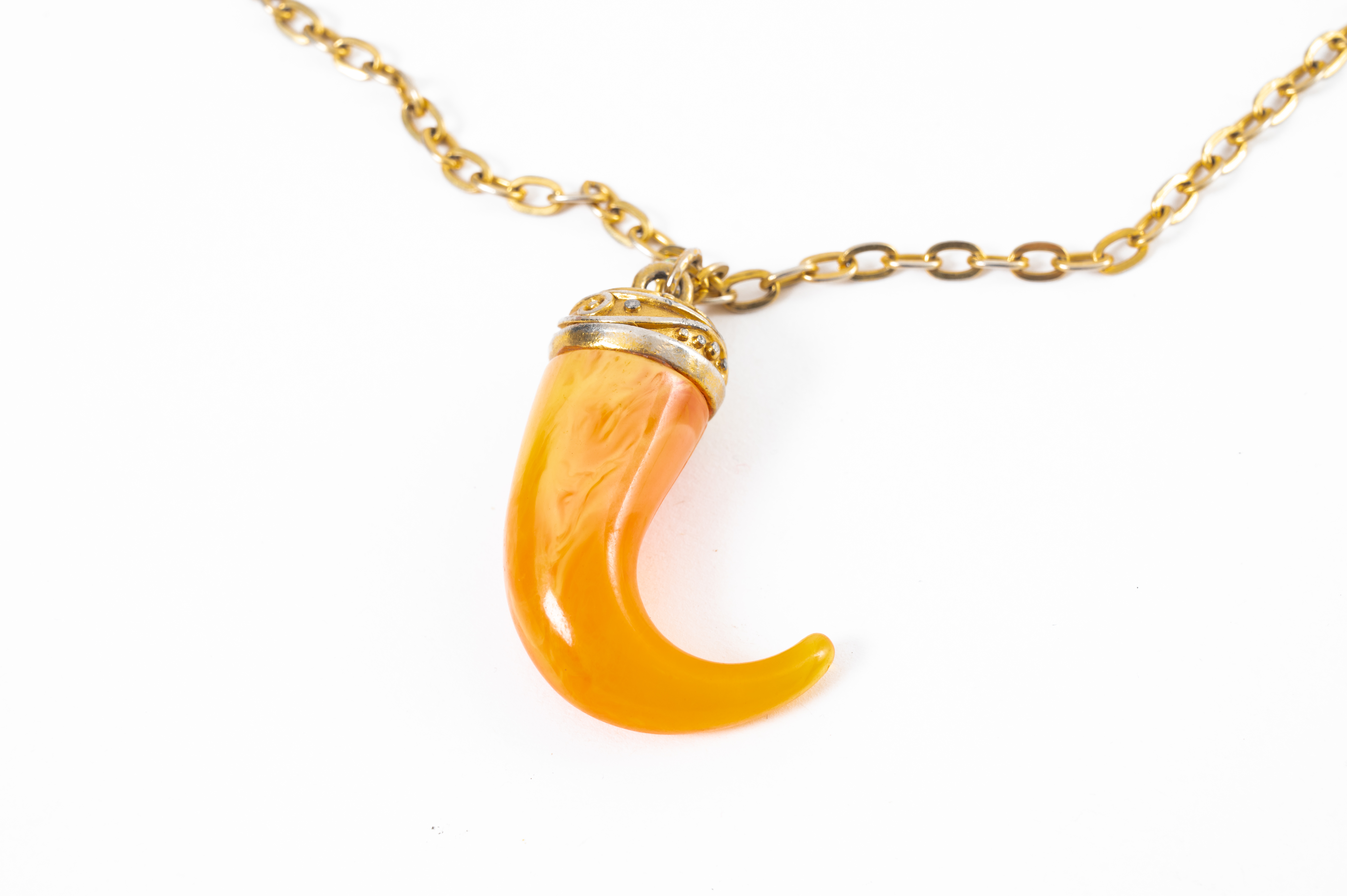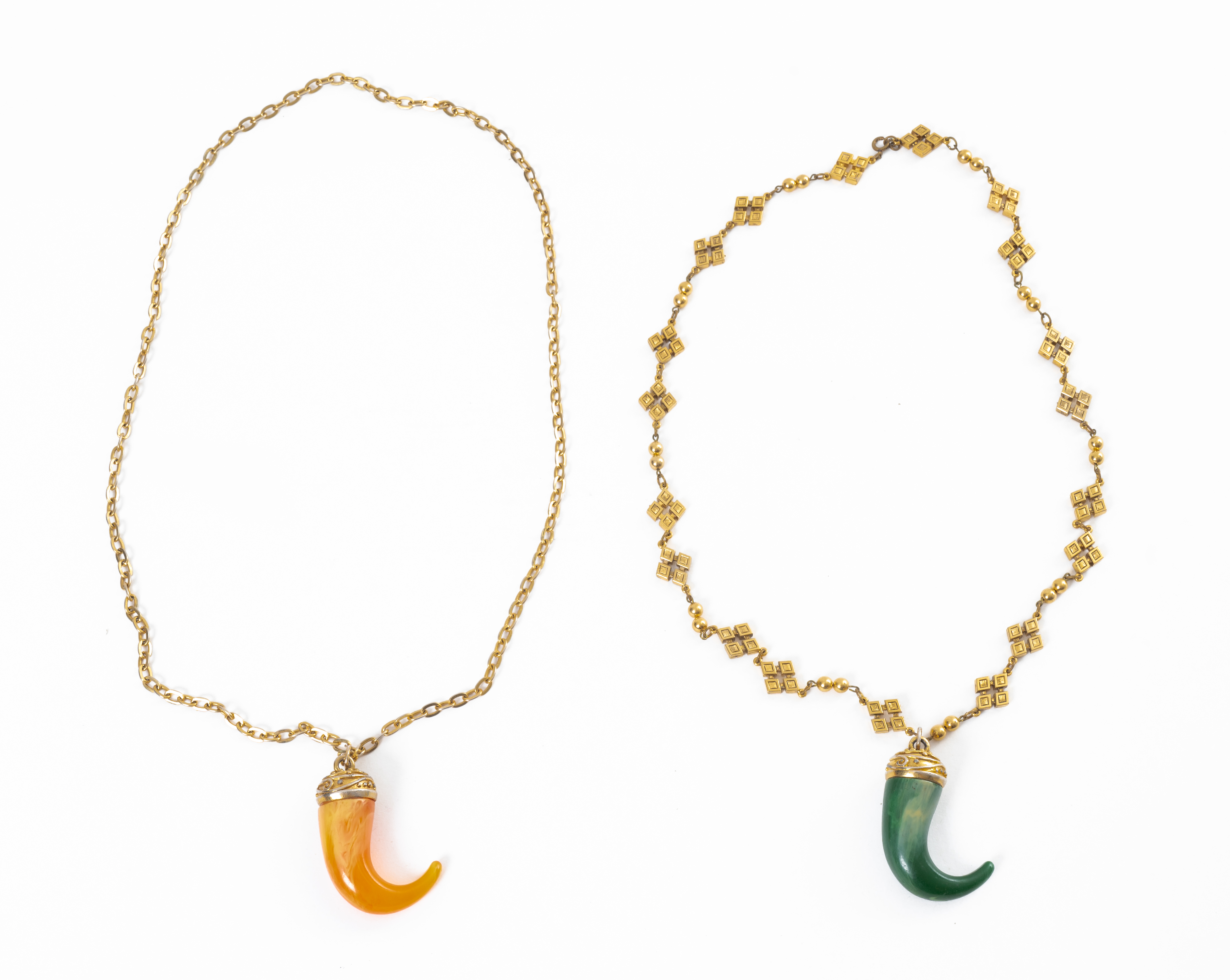 Due collane lunghe con montature in metallo dorato a maglie differenti, pendenti a corno in resina uno verde ed uno arancio.