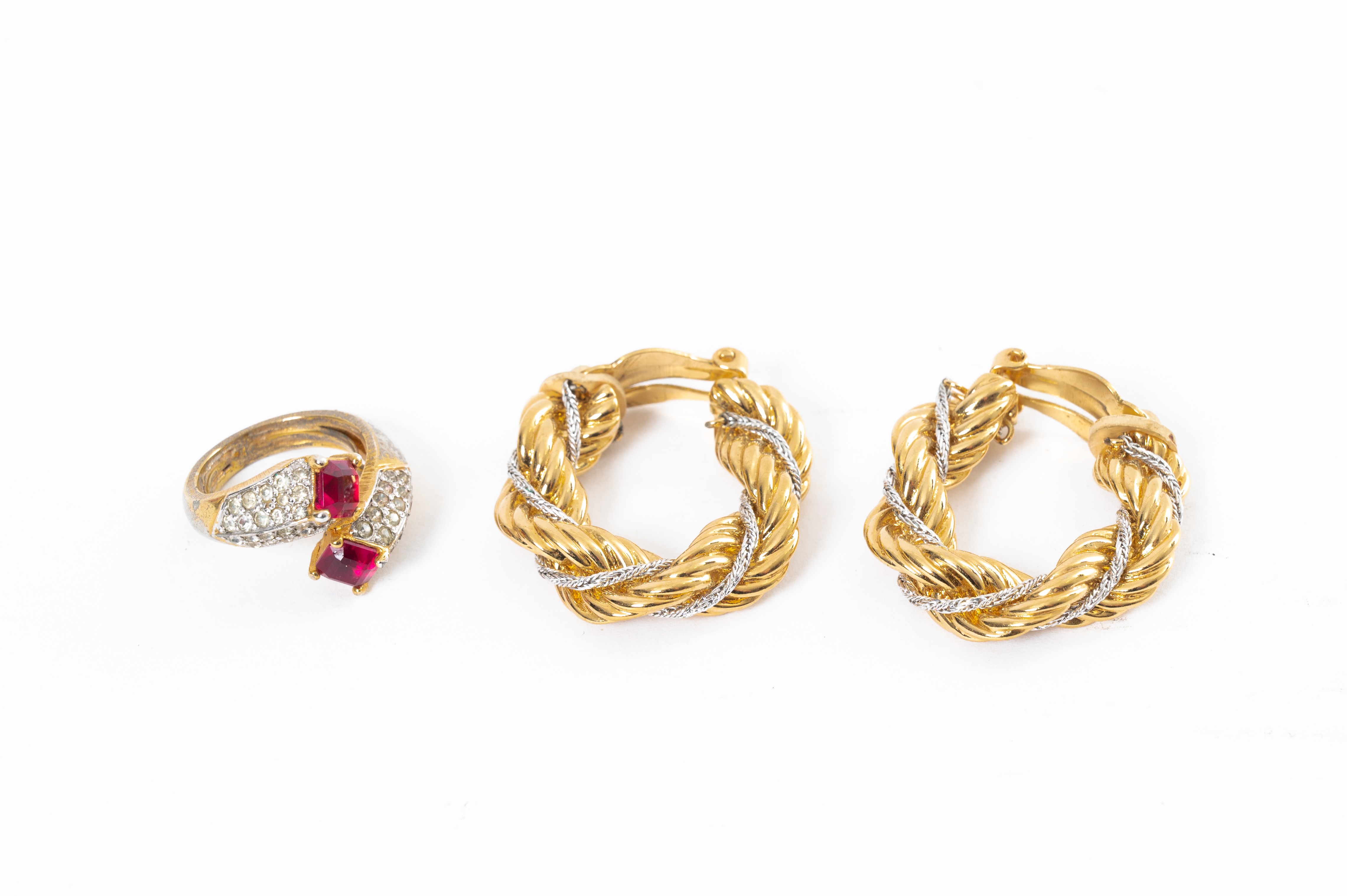 Orecchini a cerchio con montatura in metallo dorato e lavorato a torchon con maglia intramezzata in metallo diamantato, chiusura a clips. Un anello con montatura in metallo dorato e parzialmente ricoperto da diamanti sintetici, due rubini sintetici taglio princess contrarie.