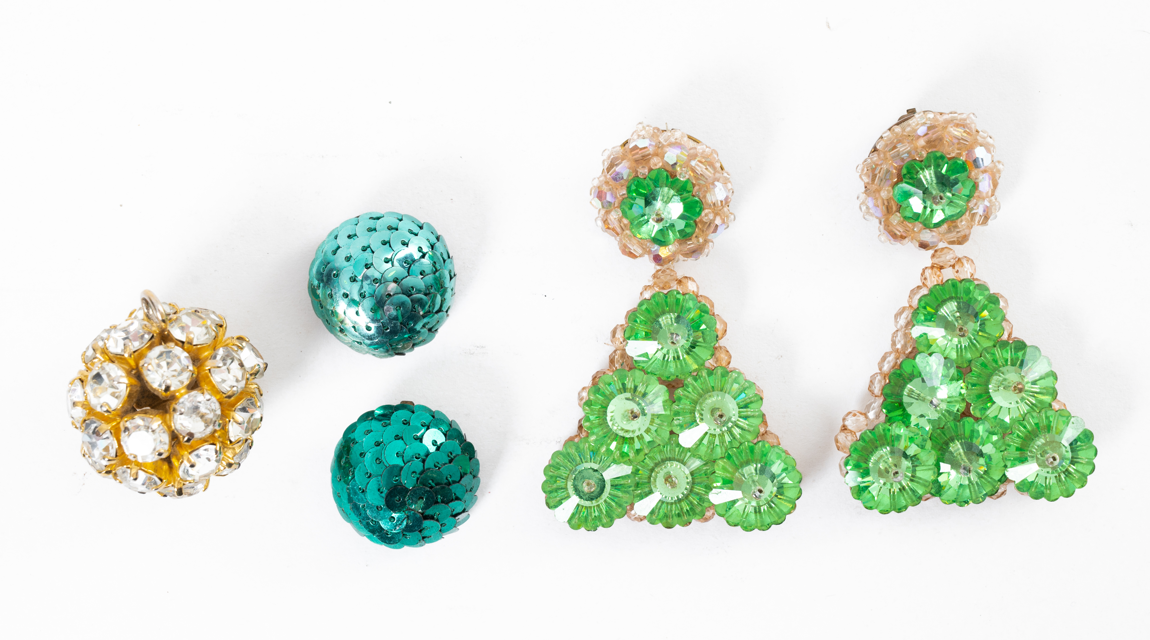Orecchini pendenti con montatura in metallo, strass iridati e strass verdi. Orecchini semisferici con montatura in metallo, paillettes verdi, chiusura clips. Ciondolo sferico con montatura in metallo dorato e diamanti sintetici taglio brillante.