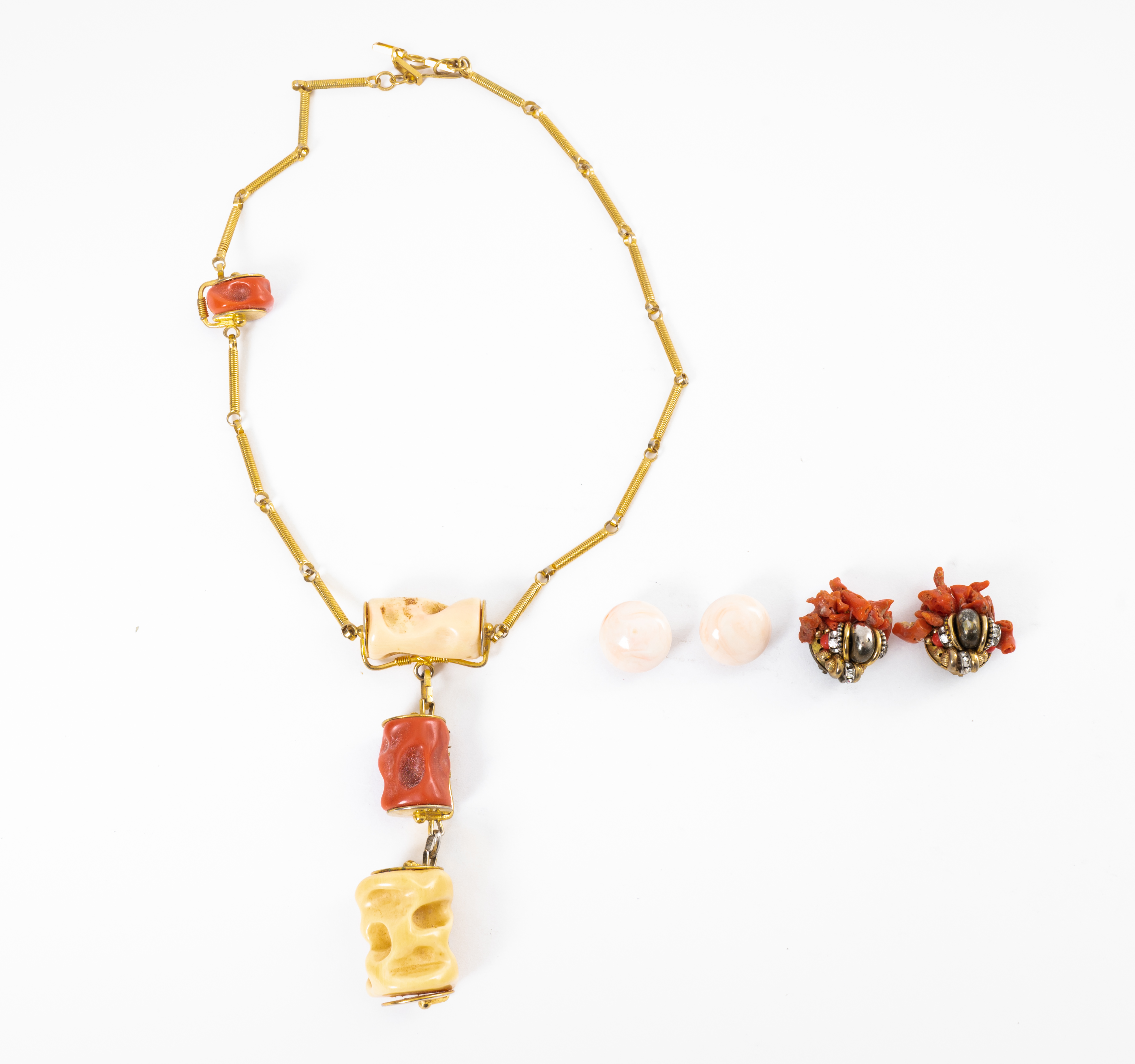 Collana con montatura in metallo dorato composta da elementi rigidi a bacchetta con snodi, coralli sintetici di grosso spessore. Orecchini con montatura in metallo, cabochon semisferici in corallo sintetico rosa, chiusura a clips. Orecchini con montatura in metallo dorato, rami di corallo, diamanti sintetici, metallo brunito, chiusura a clips.
