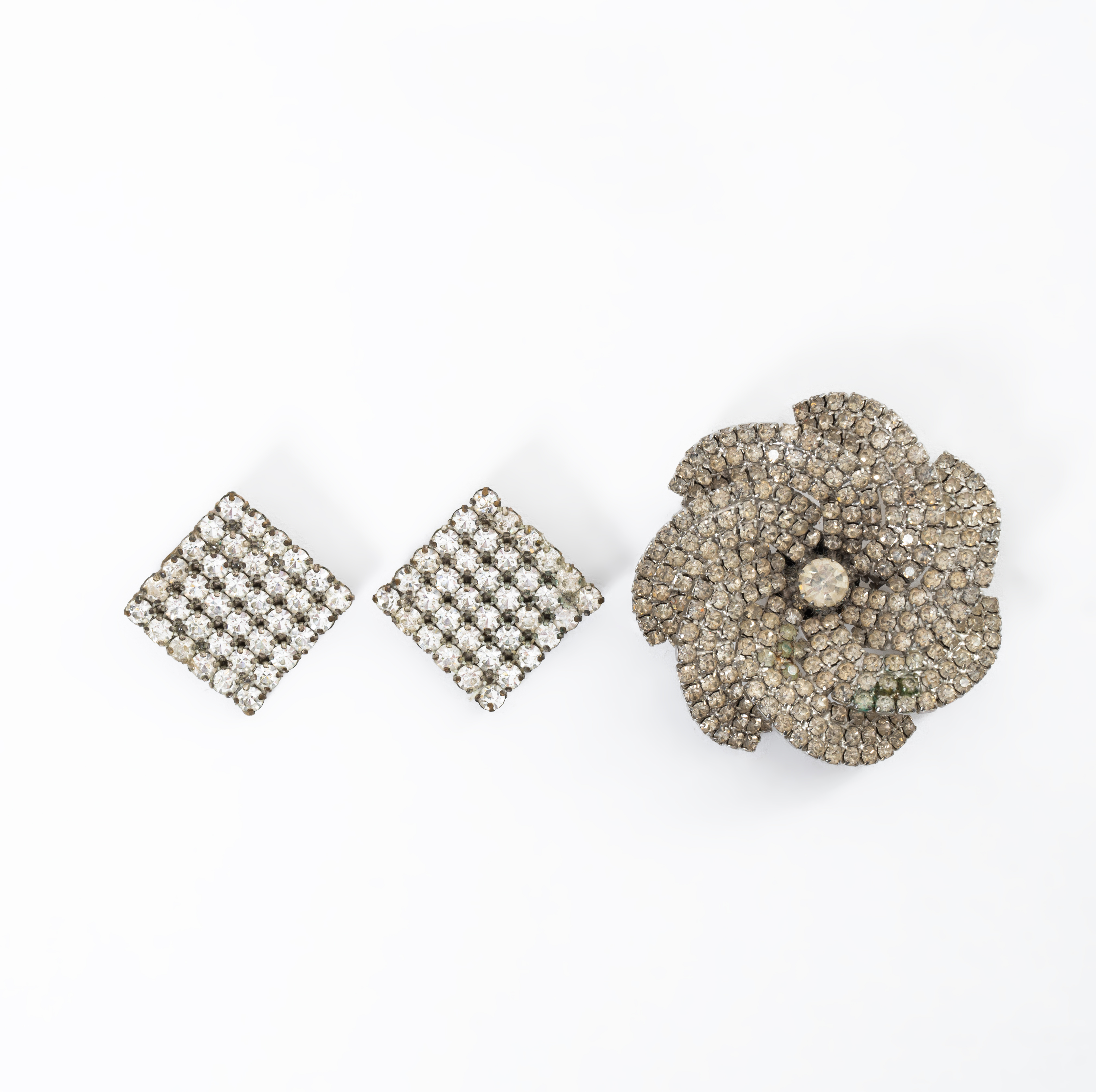 Una spilla a fiore con montatura in metallo argentato, petali sovrapposti interamente ricoperta da pavè in strass, centrale di grossa caratura. Orecchini quadrati con montatura in metallo argentato ricoperti da pavé di diamanti sintetici.