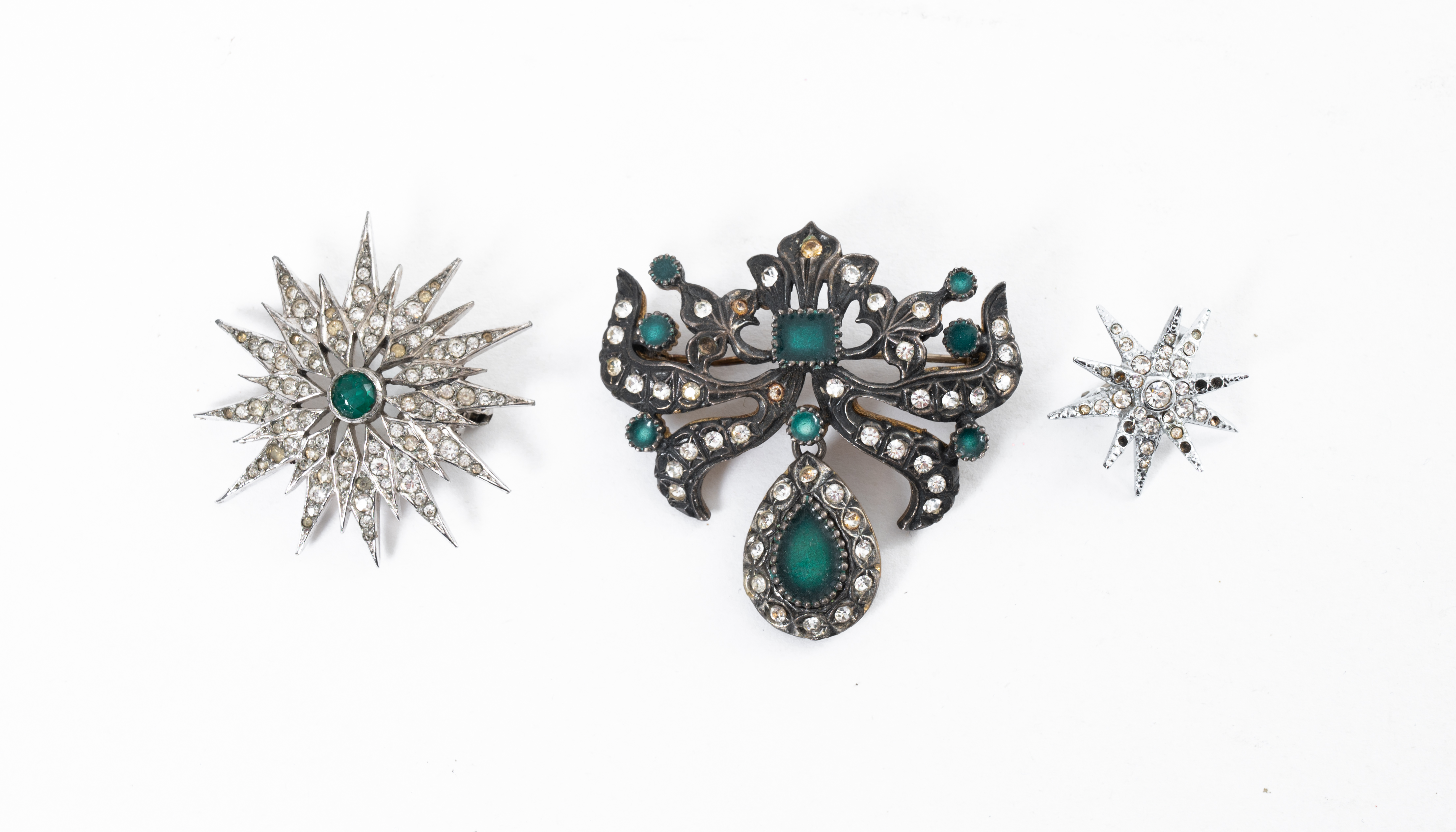 Tre spille con montatura in metallo argentato, una a batti petto con diamanti e smeraldi sintetici, goccia basculante; una a stella con diamanti e smeraldo sintetici; una spilla a stella con diamanti sintetici, mancanze.