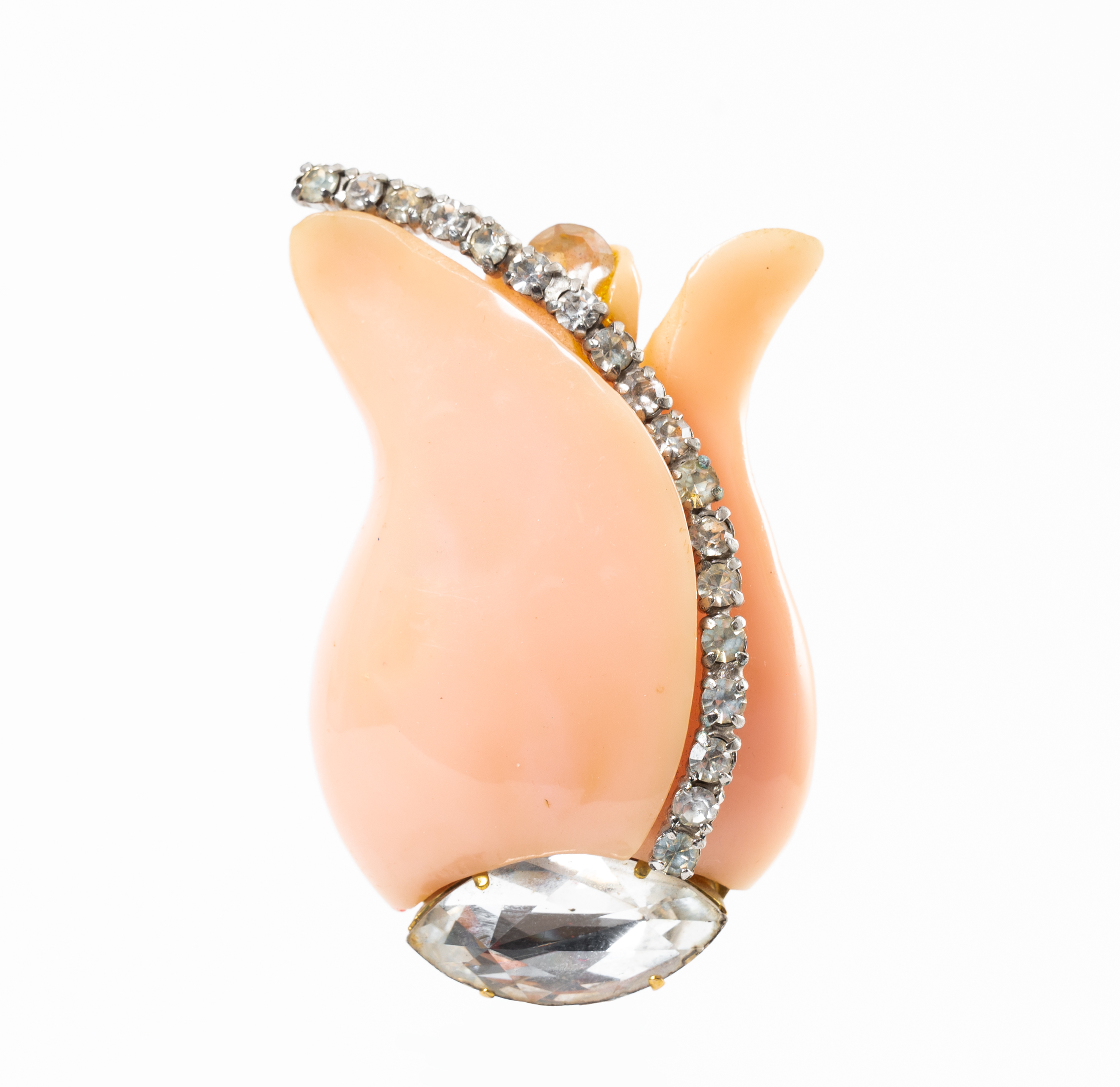 Spilla a rosa in lucite rosa, montatura in metallo argentato, diamanti sintetici taglio brillante, grosso diamante sintetico taglio marquise.