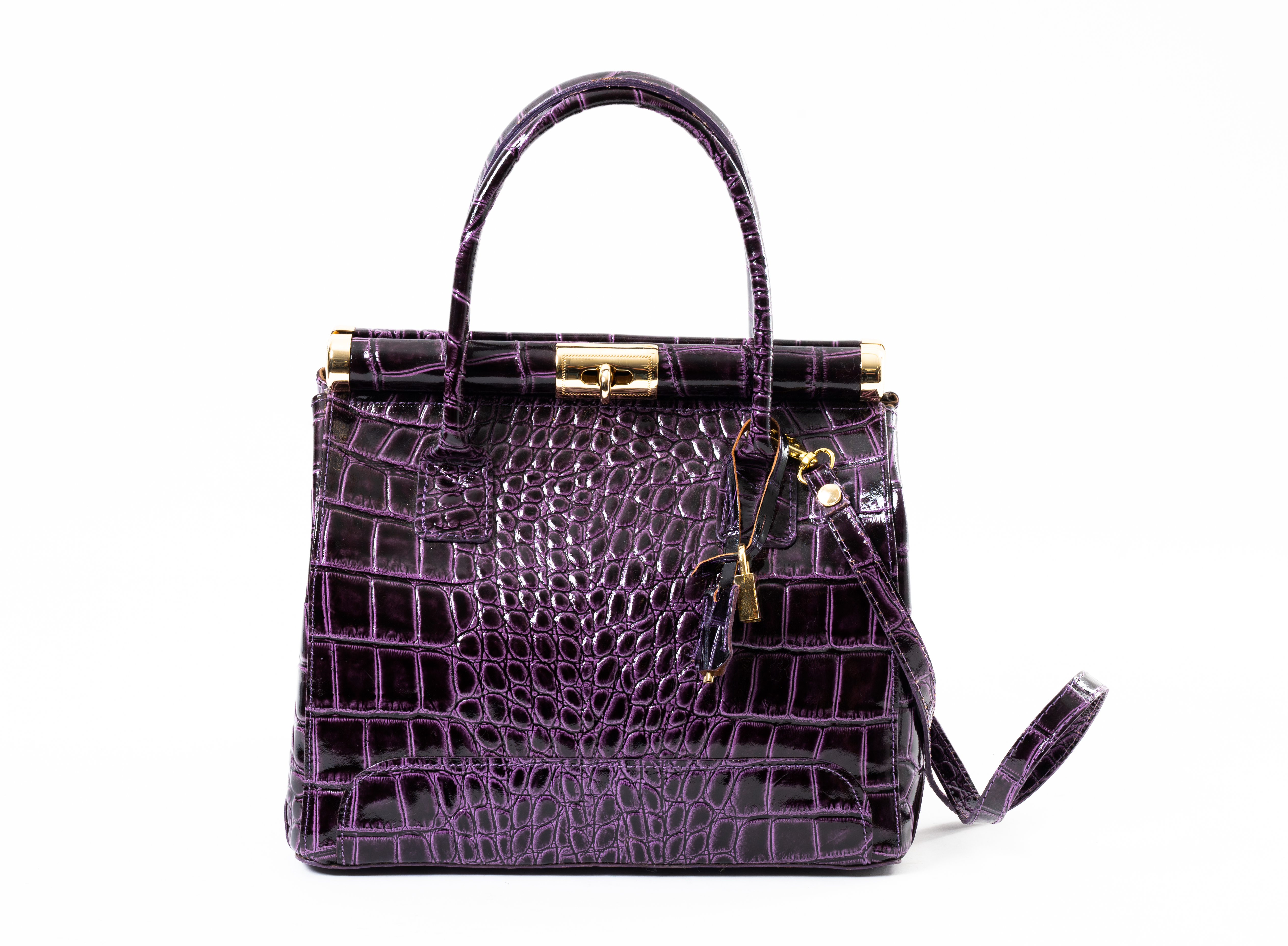 Borsa a mano in pelle a stampa coccodrillo viola, chiusura superiore con chiodo girevole e catenaccio, minuterie in metallo dorato, due manici tubolari, tasca interna, catenaccio dorato, tracolla in dotazione con moschettoni dorati.