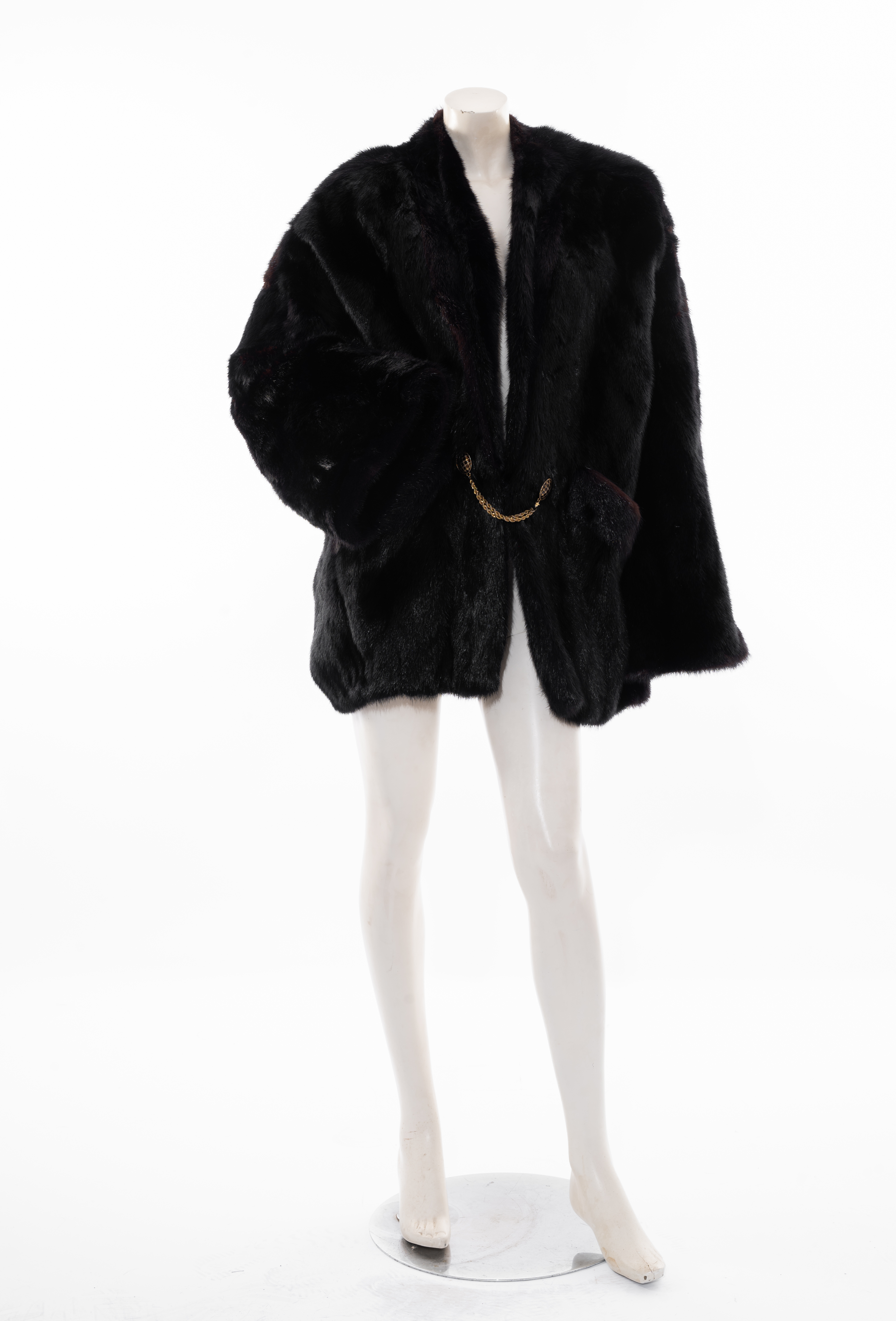 Giacca in pelliccia di visone blackglama, collo sciallato, apertura frontale con chiusura gioiello a catena, manica lievemente a tromba, tasche diagonali. Taglia L. Etichetta di produzione.