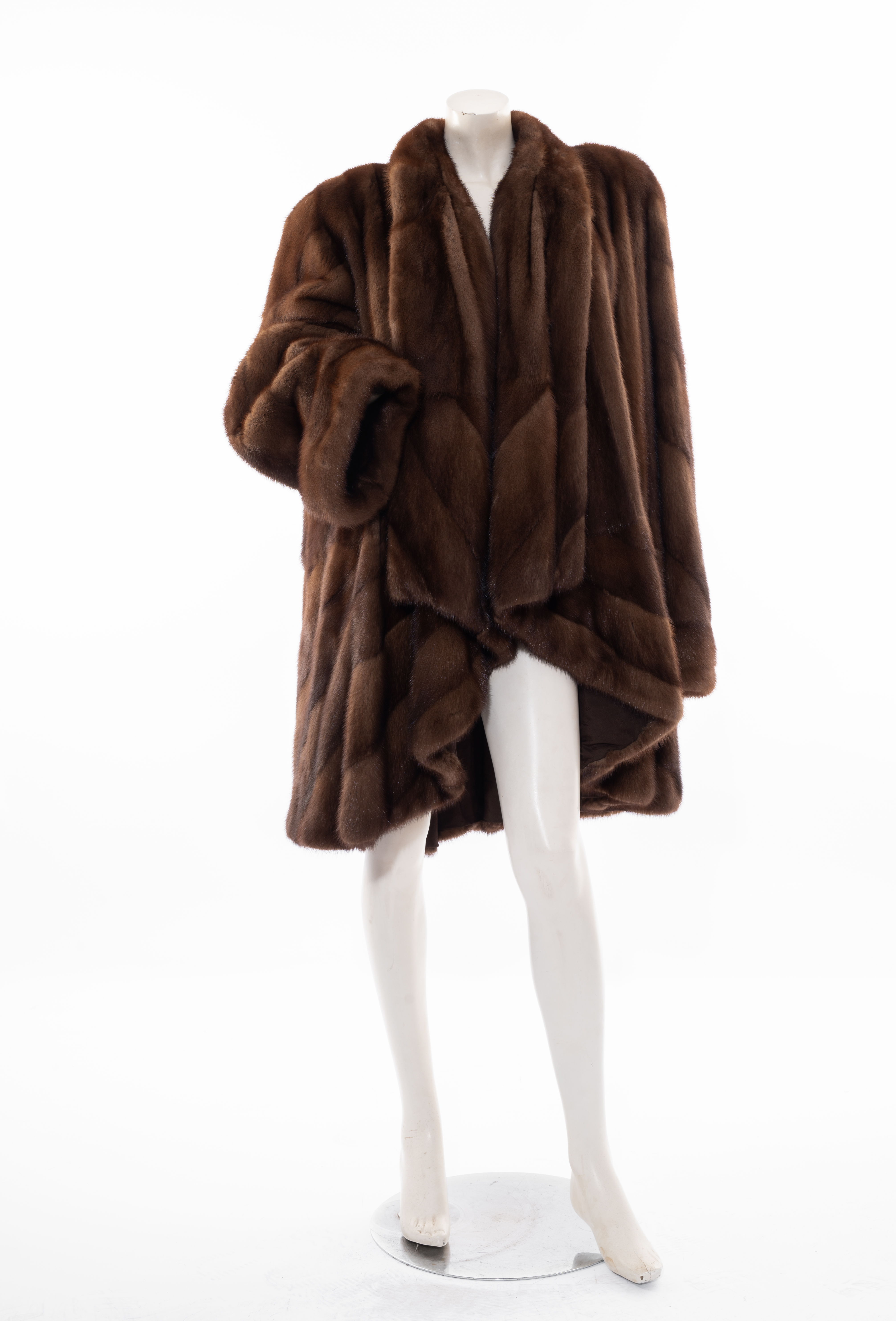 Giacca in pelliccia di visone brown, lavorazione a pelli intere a lavorazione diagonali, ampio collo sciallato, chiusura frontale, maniche con ampi polsi. Taglia L.