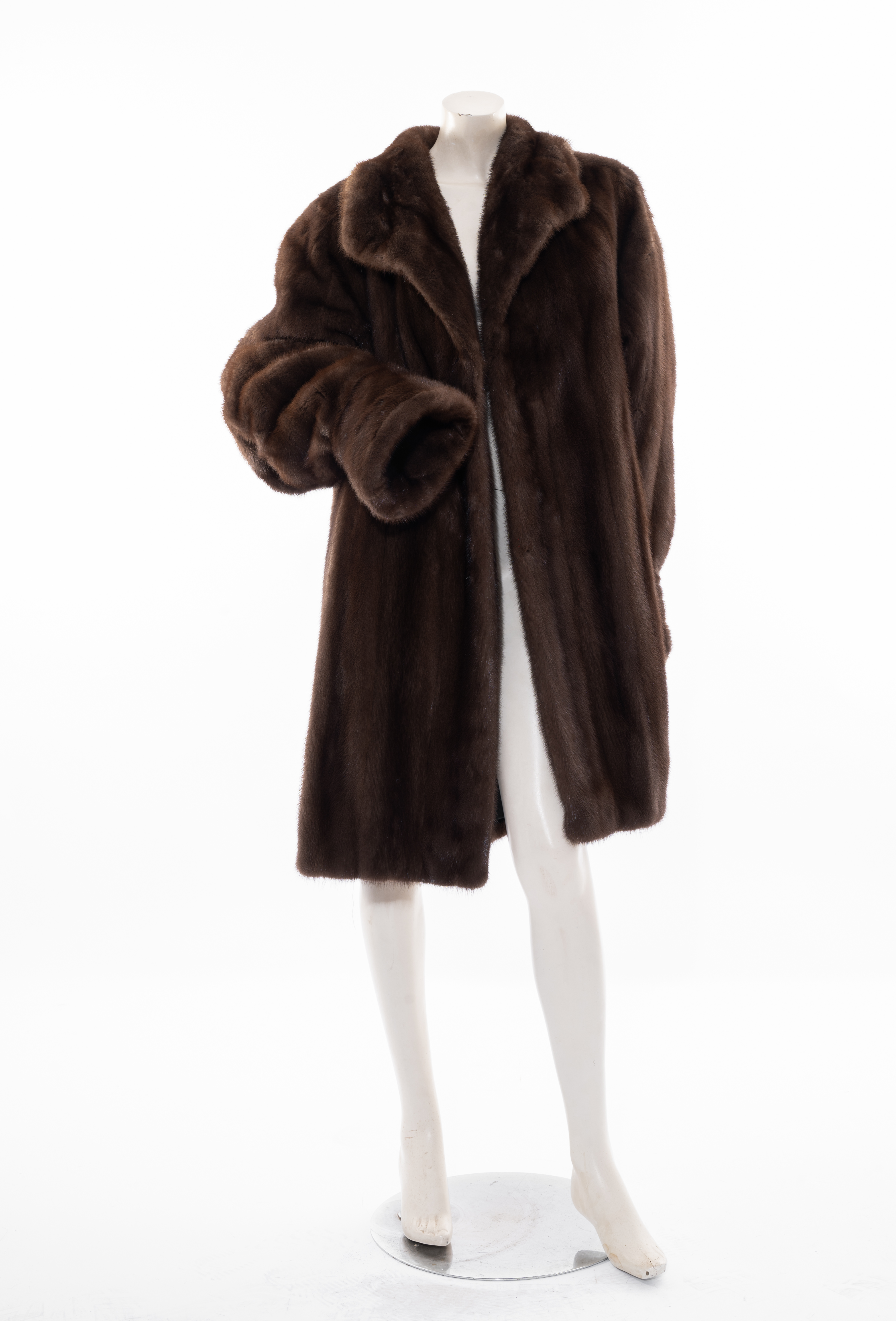 Cappotto in pelliccia di visone mogano, lavorazione a pelli intere verticali, ampio collo, chiusura frontale con ganci, polsi con lavorazione orizzontale .Taglia L.