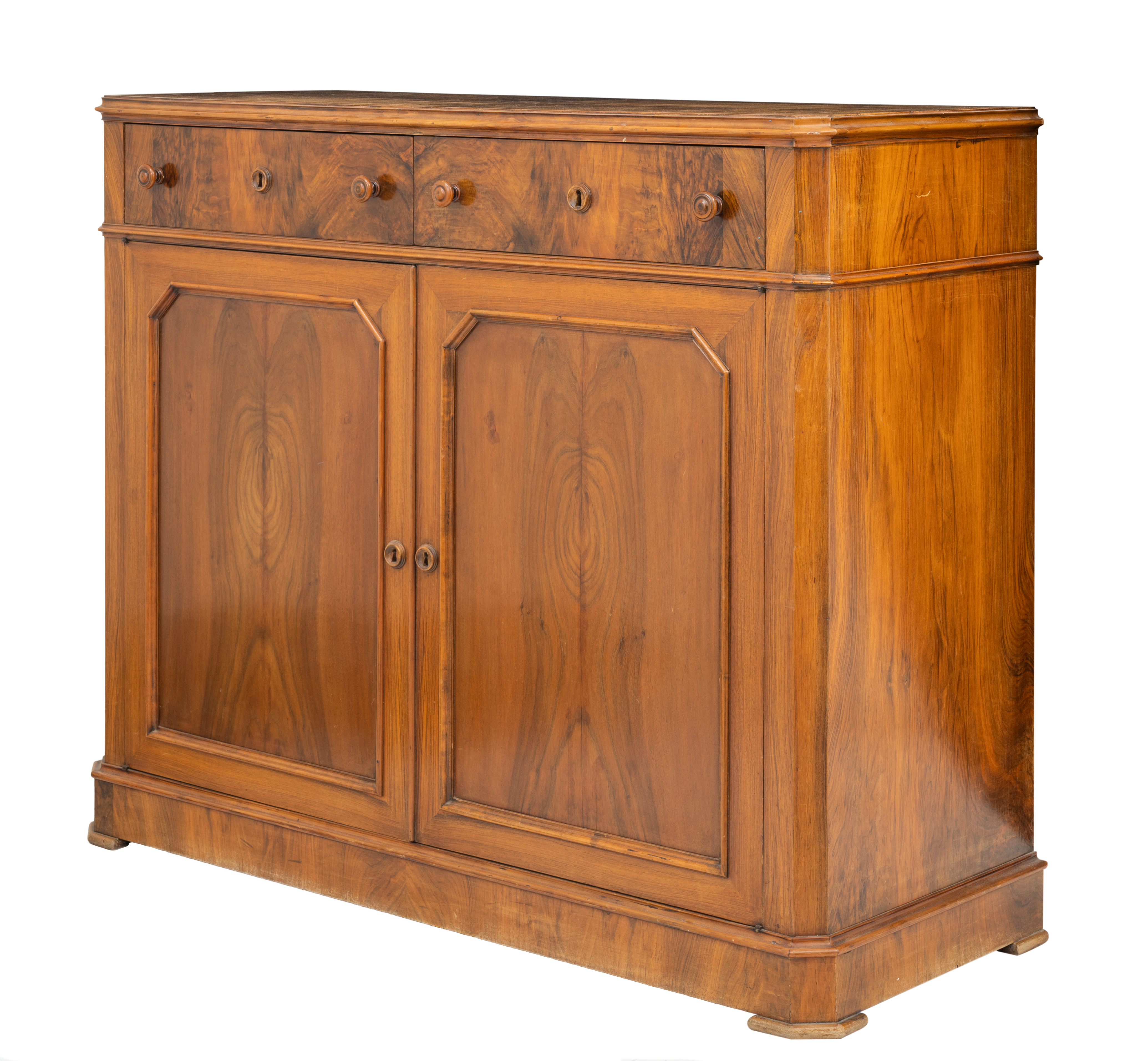 Credenza a due ante e due cassetti in legno di noce e radica di noce.
