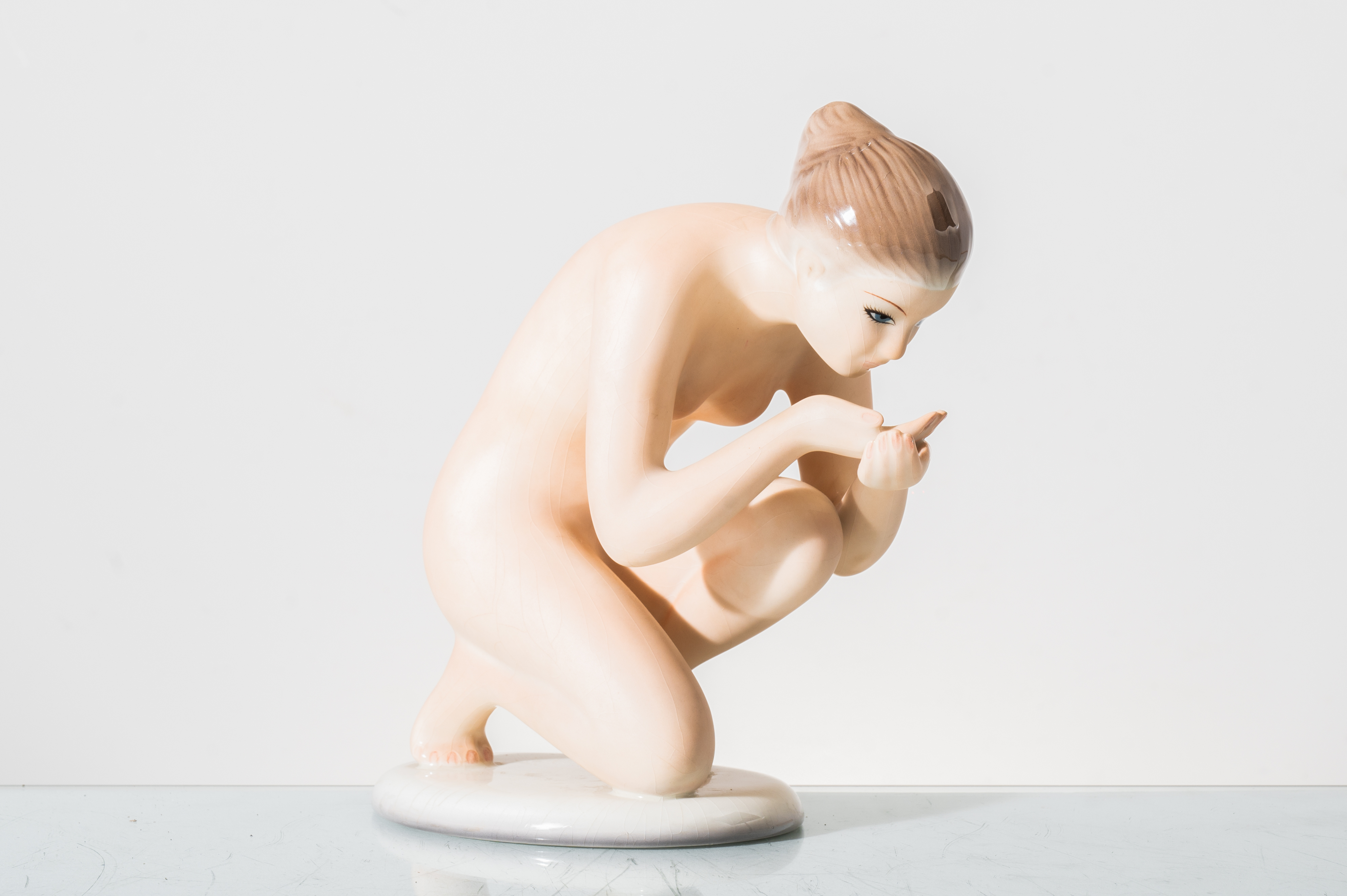 Scultura in ceramica smaltata raffigurante "Figura femminile che beve".