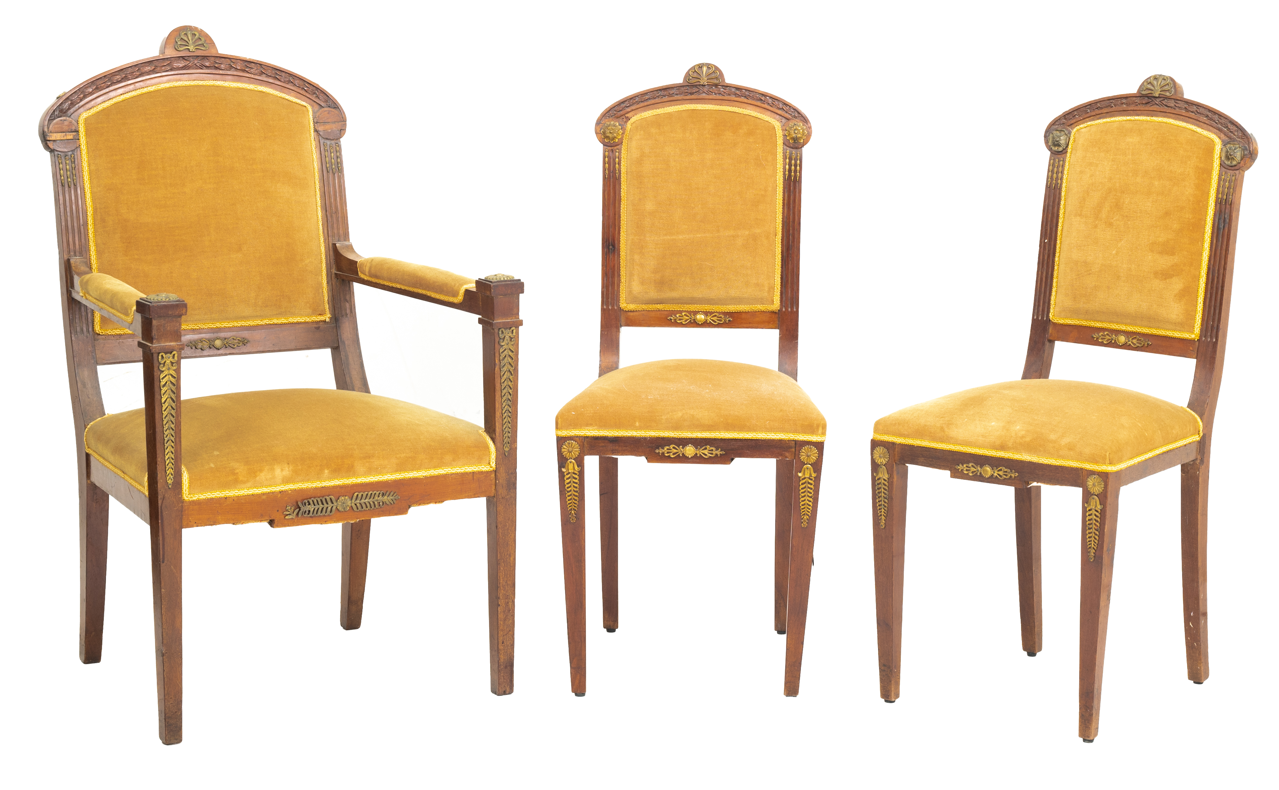 Poltrona e due sedie stile Impero in legno di noce.