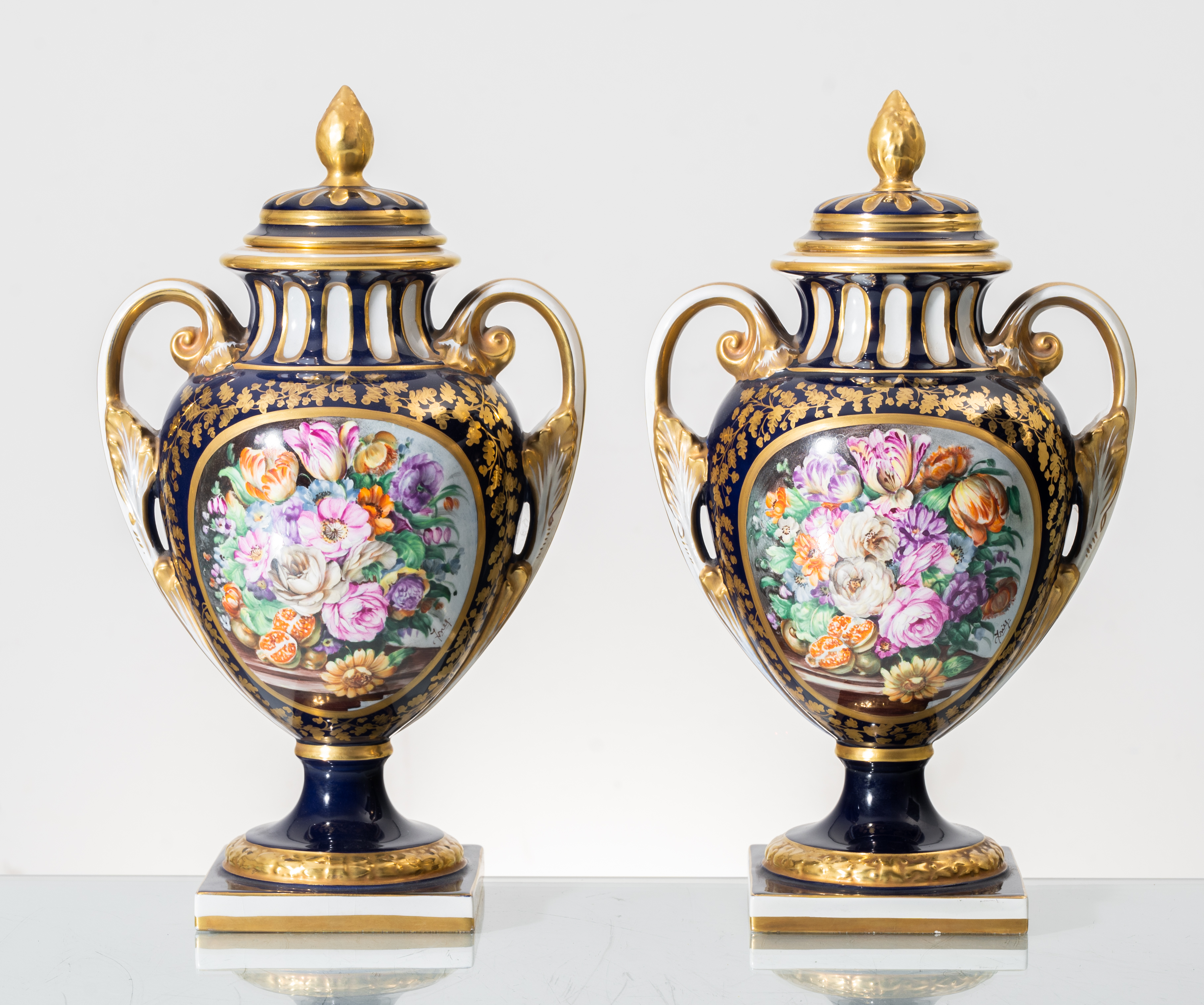 Coppia di potiche in porcellana Capodimonte decorati a mano con motivo floreali e decori in oro.