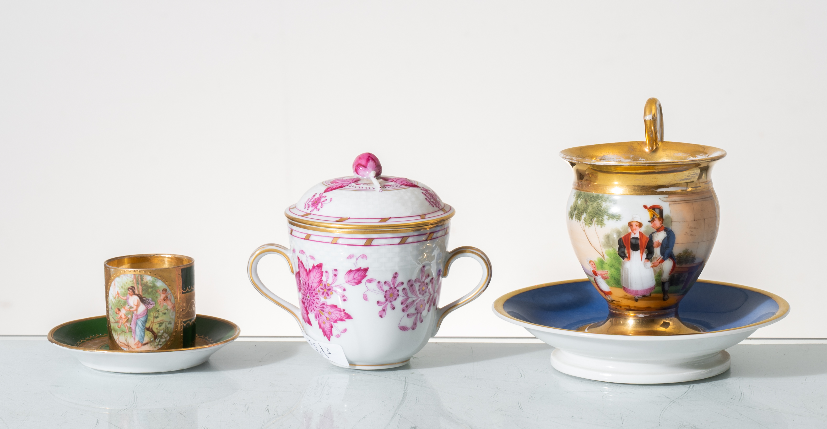 Tazzina con piattino in porcellana Vienna decorata, tazza con piattino Impero in porcellana decorata e zuccheriera in porcellana Herend.
