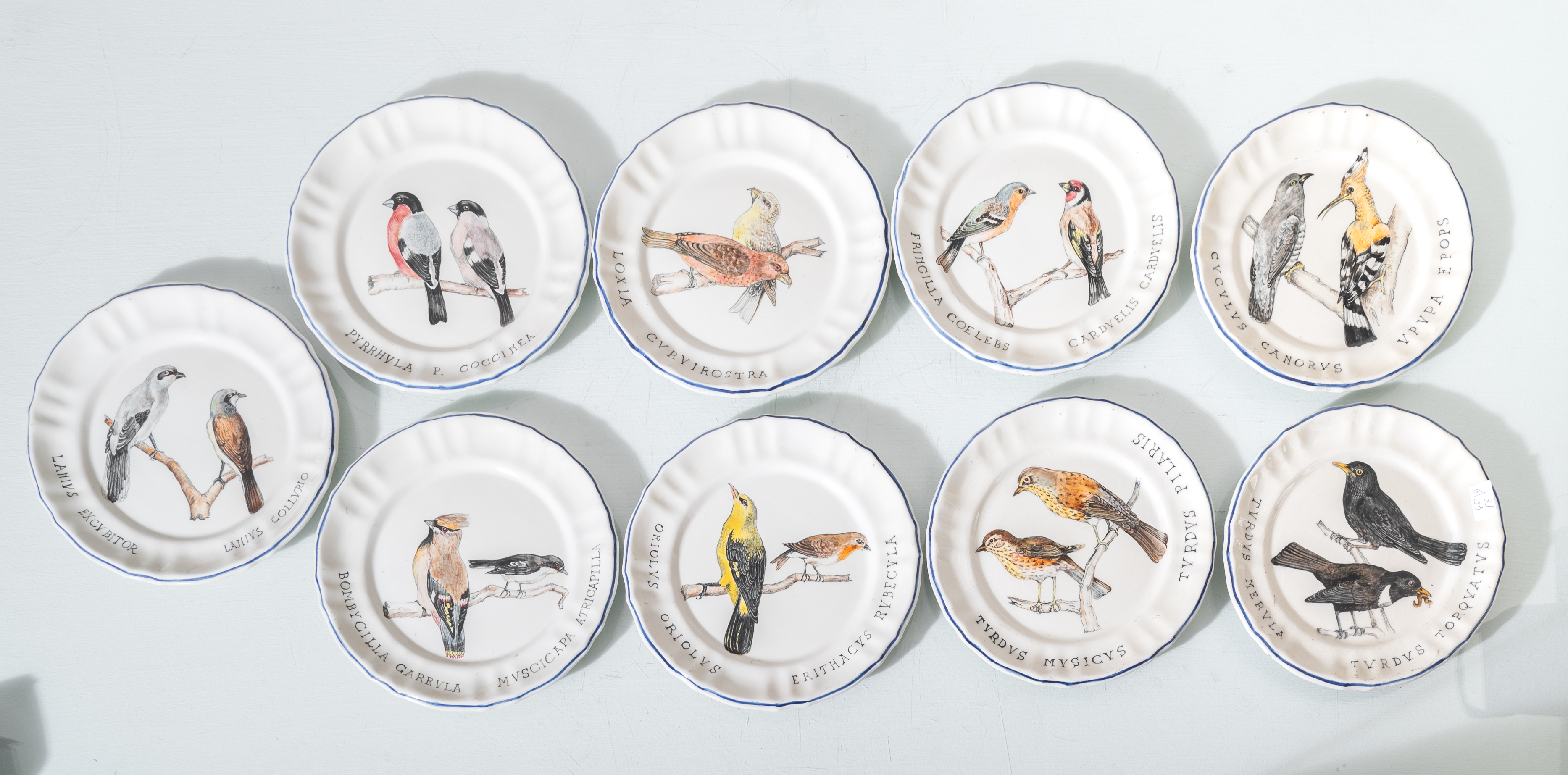 Nove piatti in ceramica smaltata raffiguranti "Volatili".