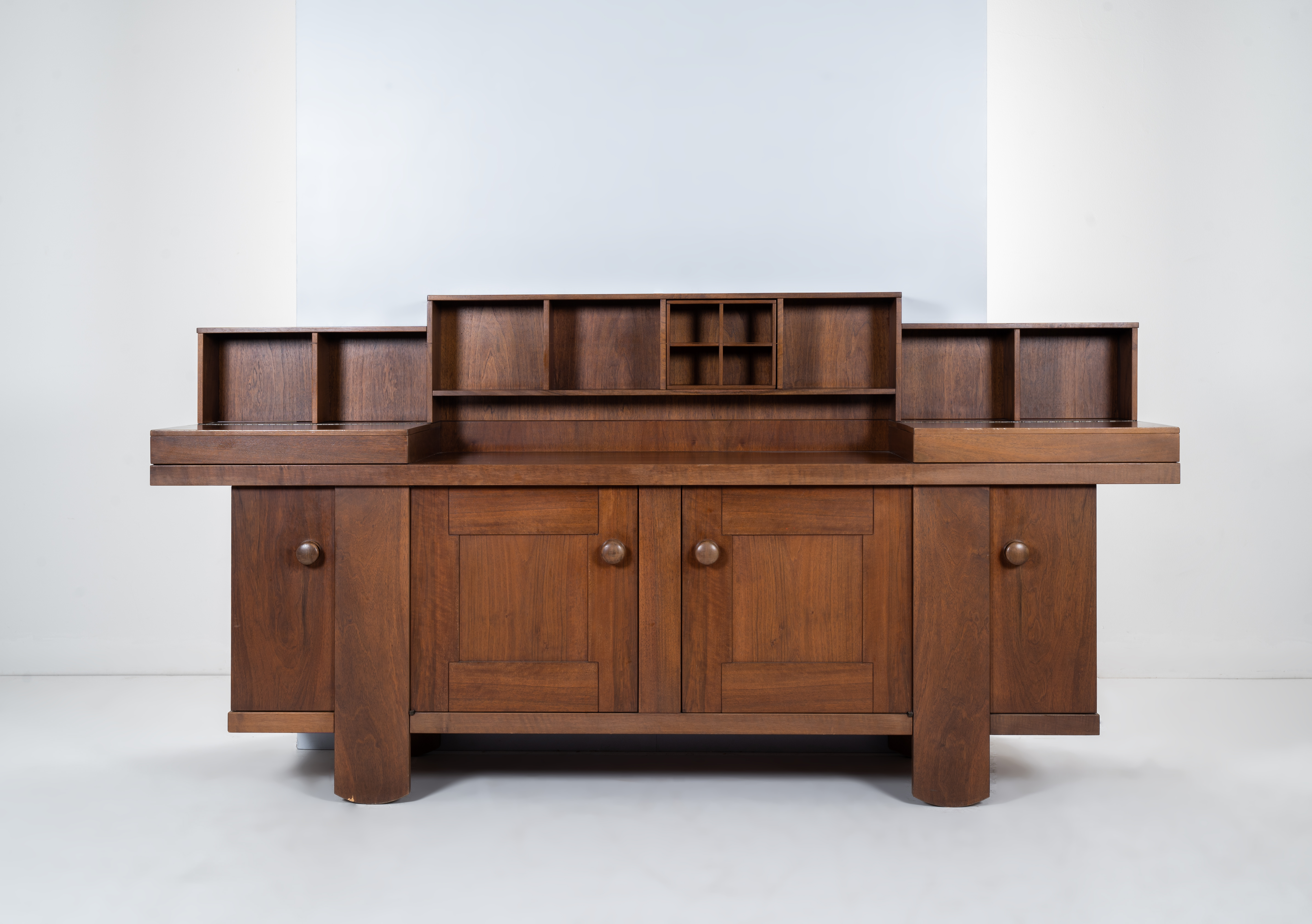 Credenza in legno di noce modello “602”, sul fronte vani a giorno sulla parte sovrastante e vani chiusi con ante a battente. Segni di uso.