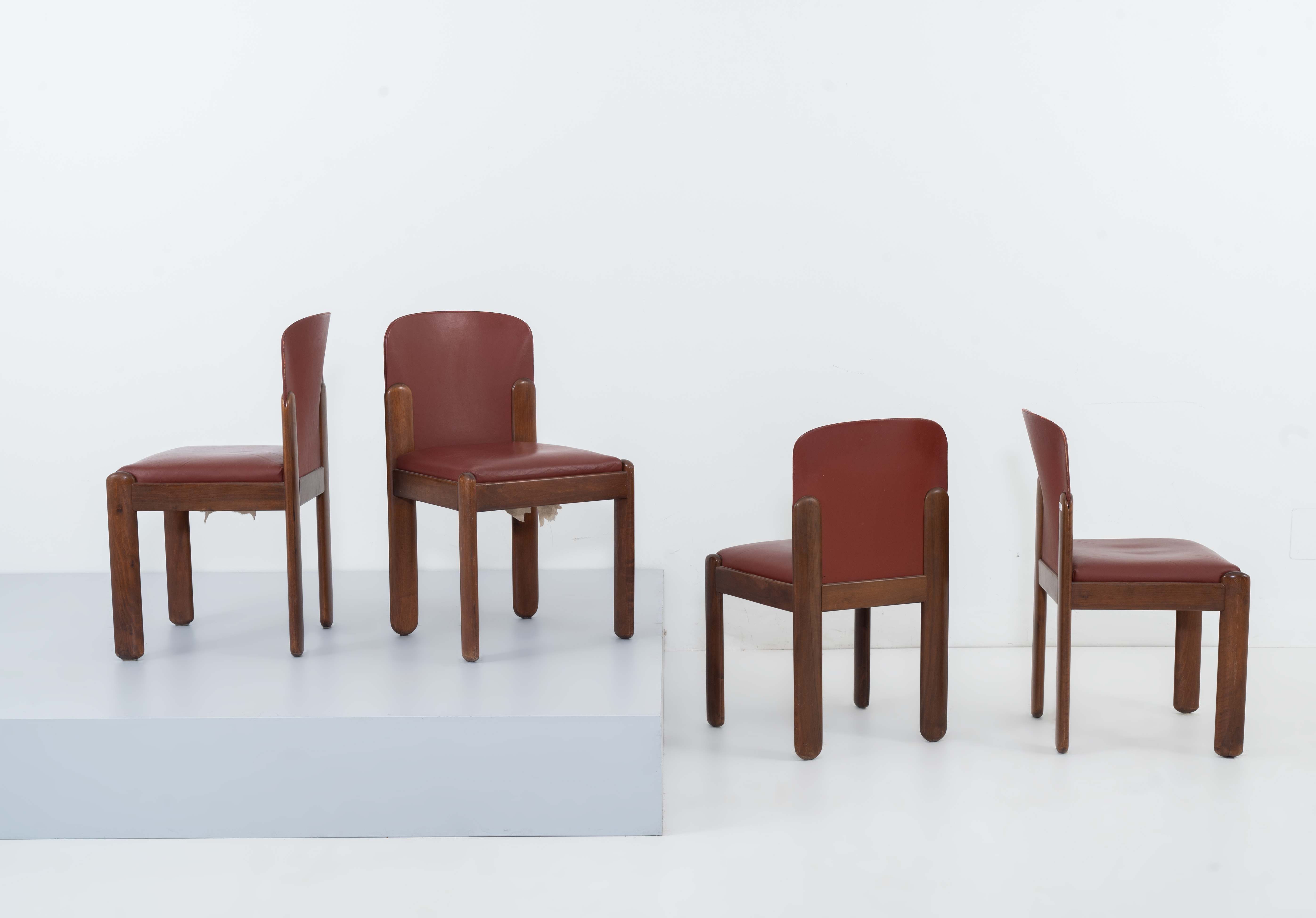 Quattro sedie modello “330” con struttura in legno, spalliera e seduta con imbottitura e rivestimento in pelle marrone. Lievi segni di uso.