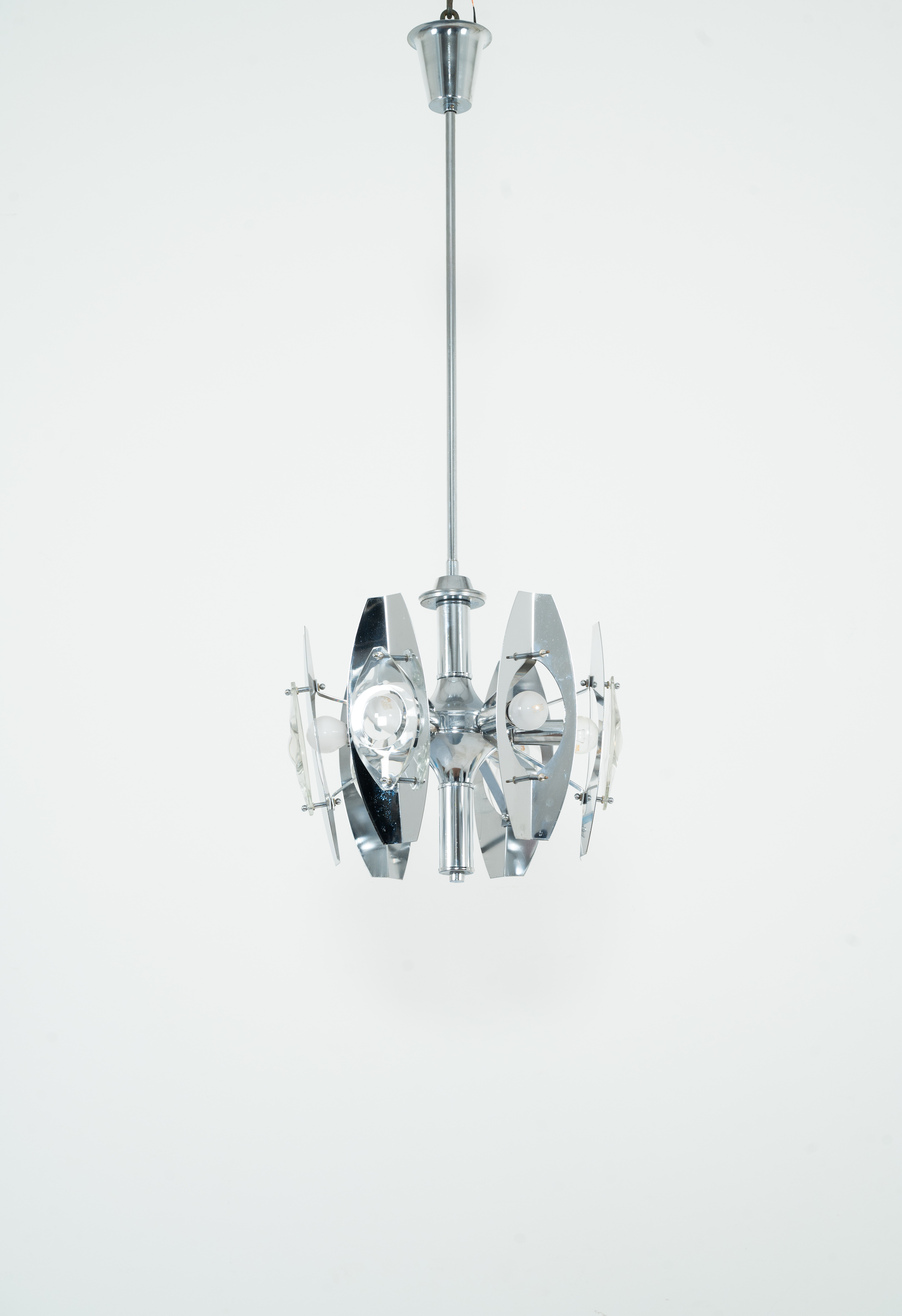 Lampada a sospensione a sei luci, struttura in metallo cromato, diffusori a losanga in metallo cromato con vetri incolori a lenti convesse. Lente mancante.