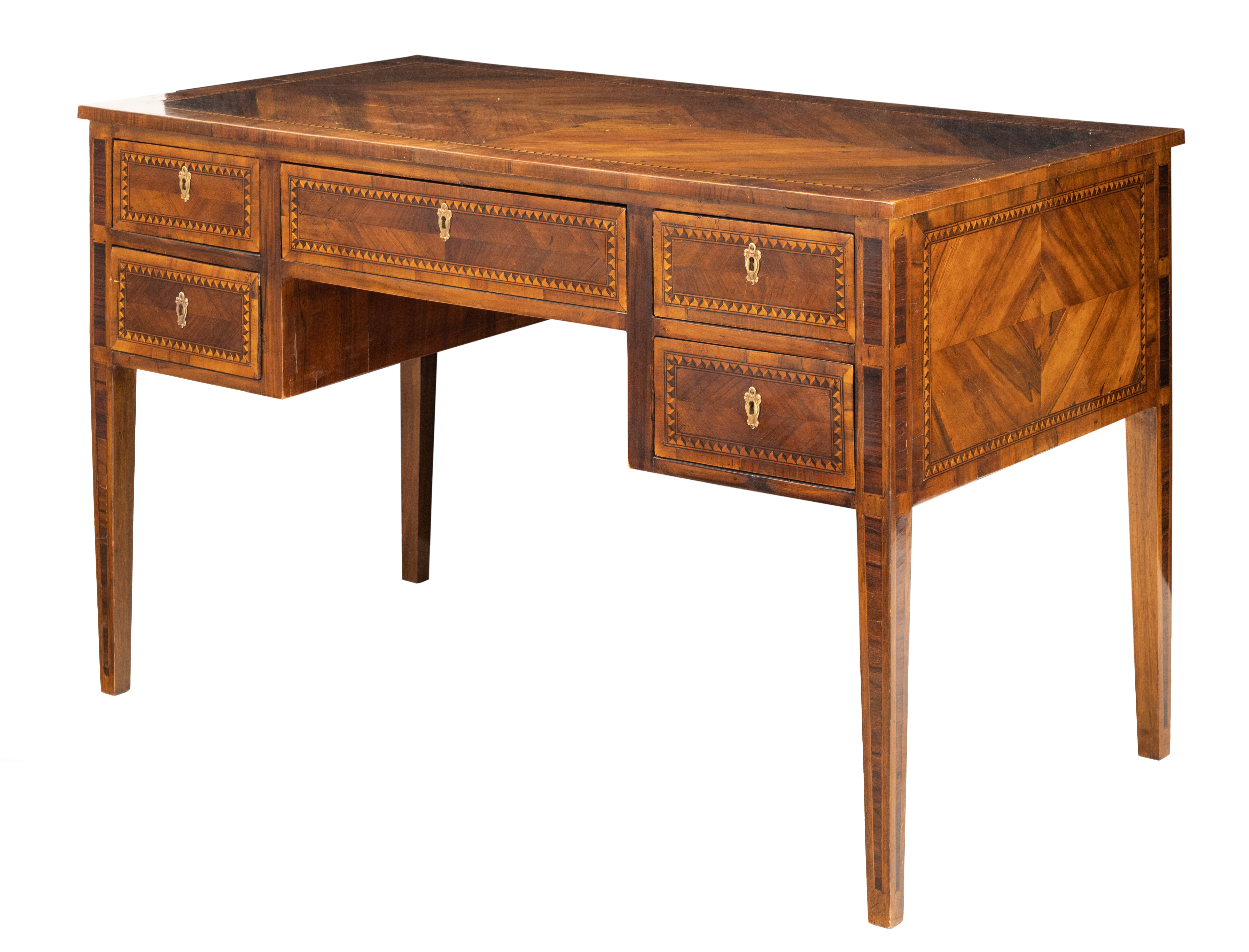 Scrittoio da centro stile Luigi XVI a cinque cassetti in legno di noce con perfili in bosso.