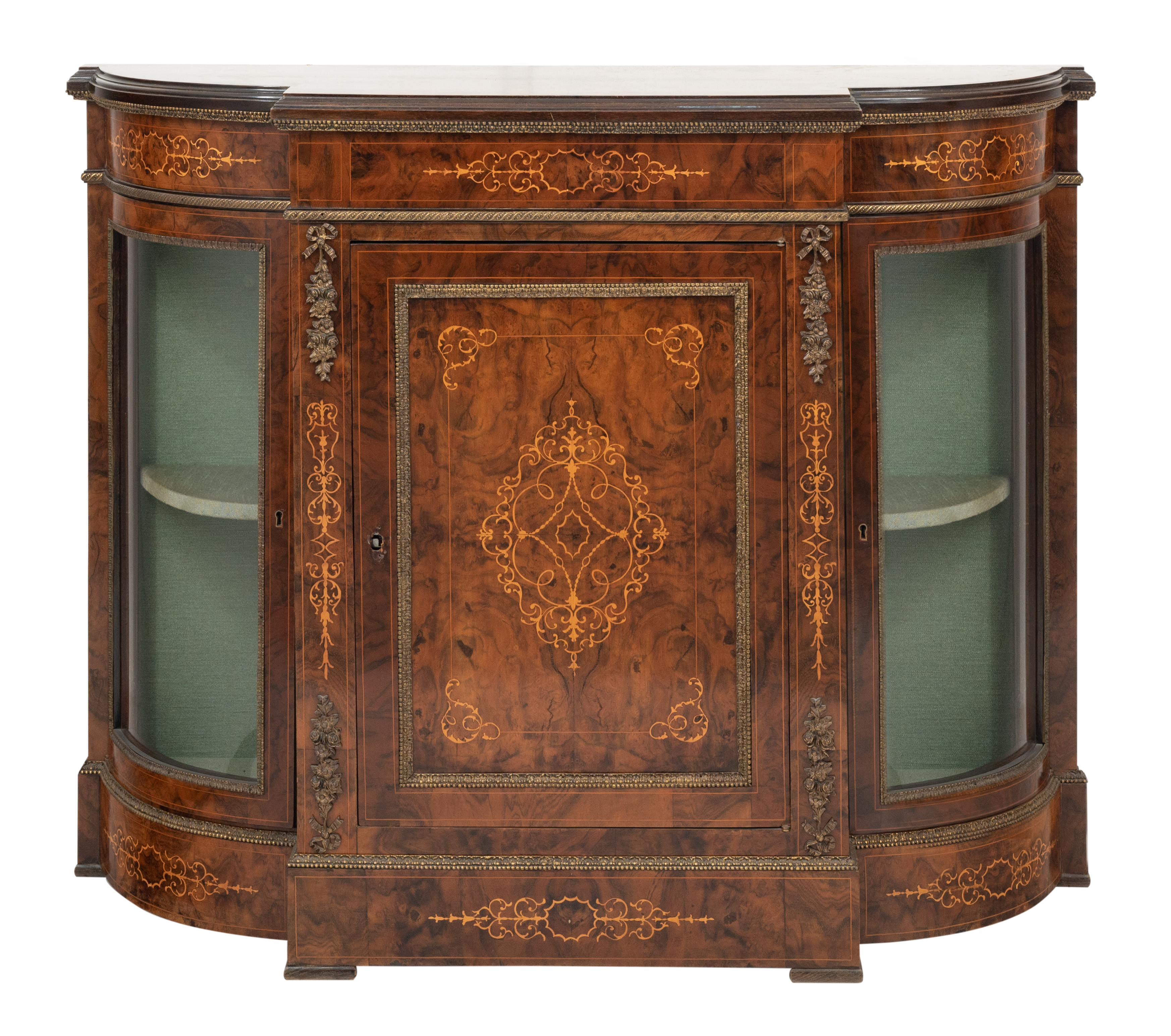 Servante di forma sagomata con anta centrale e due a vetri in legno di noce e radica di noce, riccamente intarsiata in legno di bosso, guarniture in bronzo dorato.