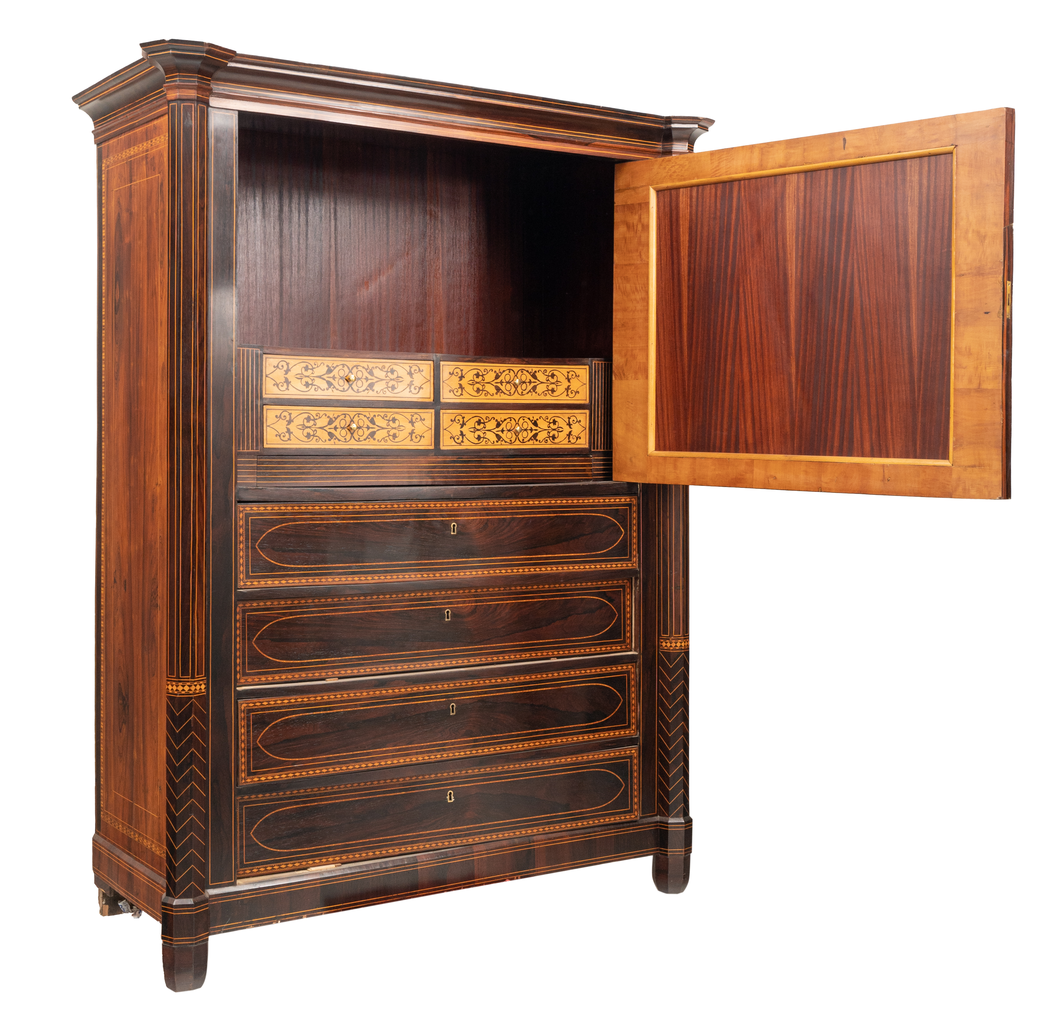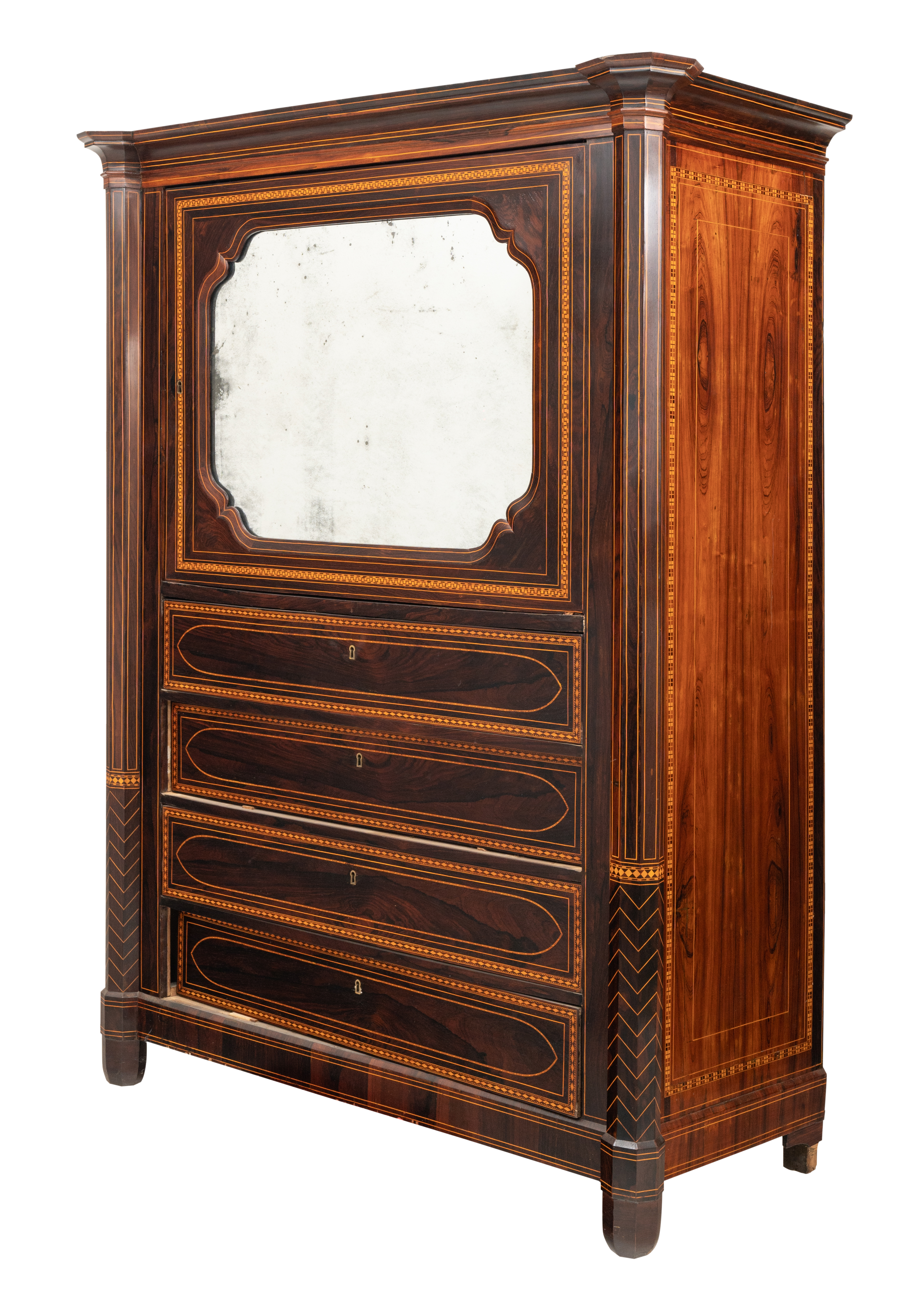 Chiffonier di gusto neogotico con quattro cassetti ed un'anta con specchio in legno esotico, tarsie e perfili in legno di bosso.