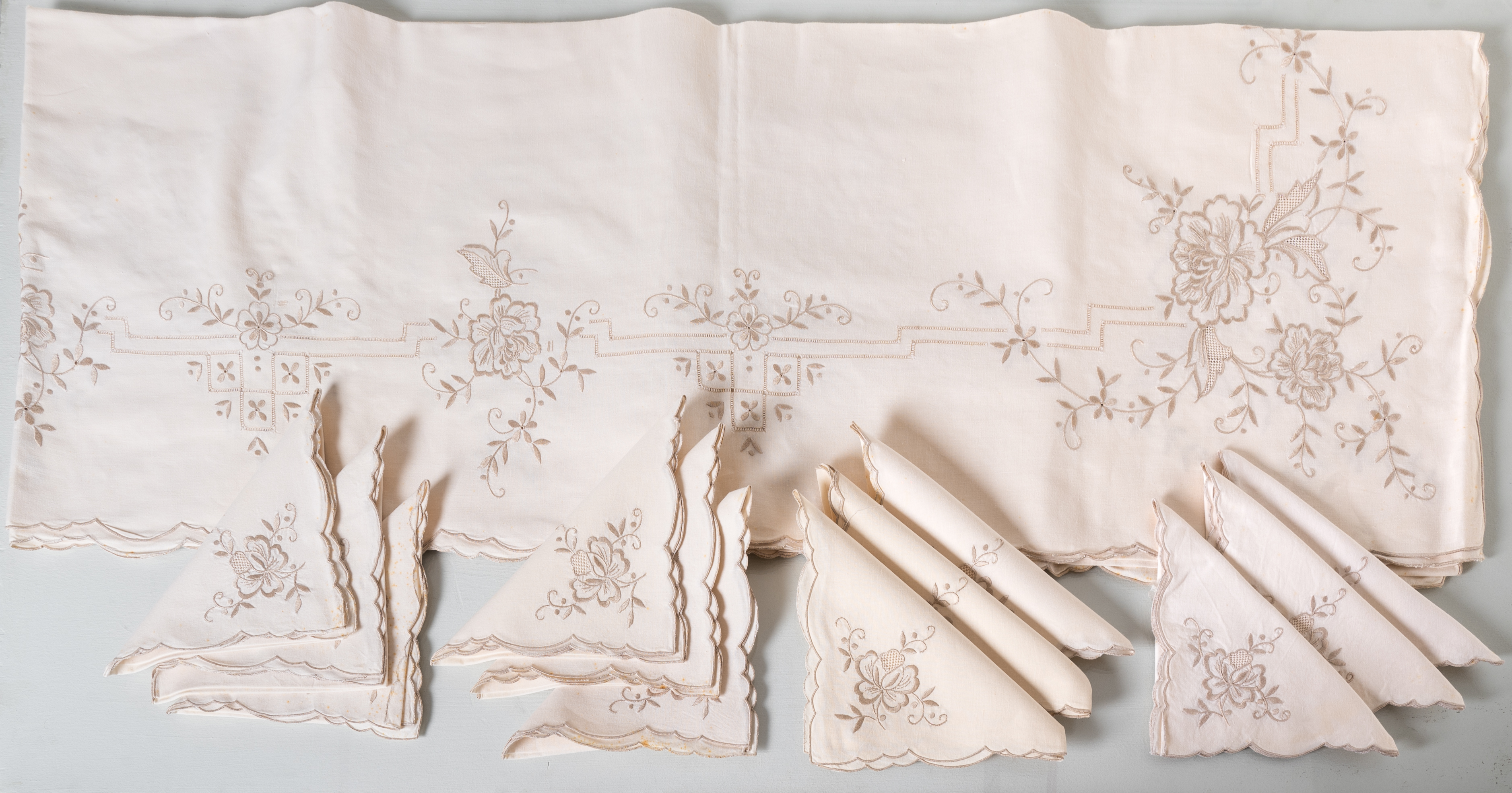 TOVAGLIA rettangolare con dodici tovaglioli in tessuto di cotone nei toni del beige con ricami a mano.
