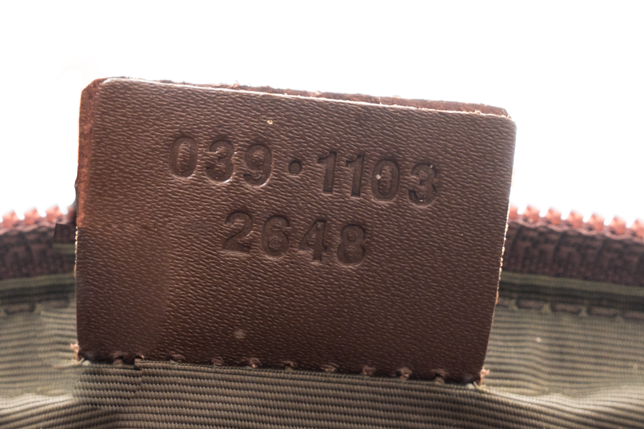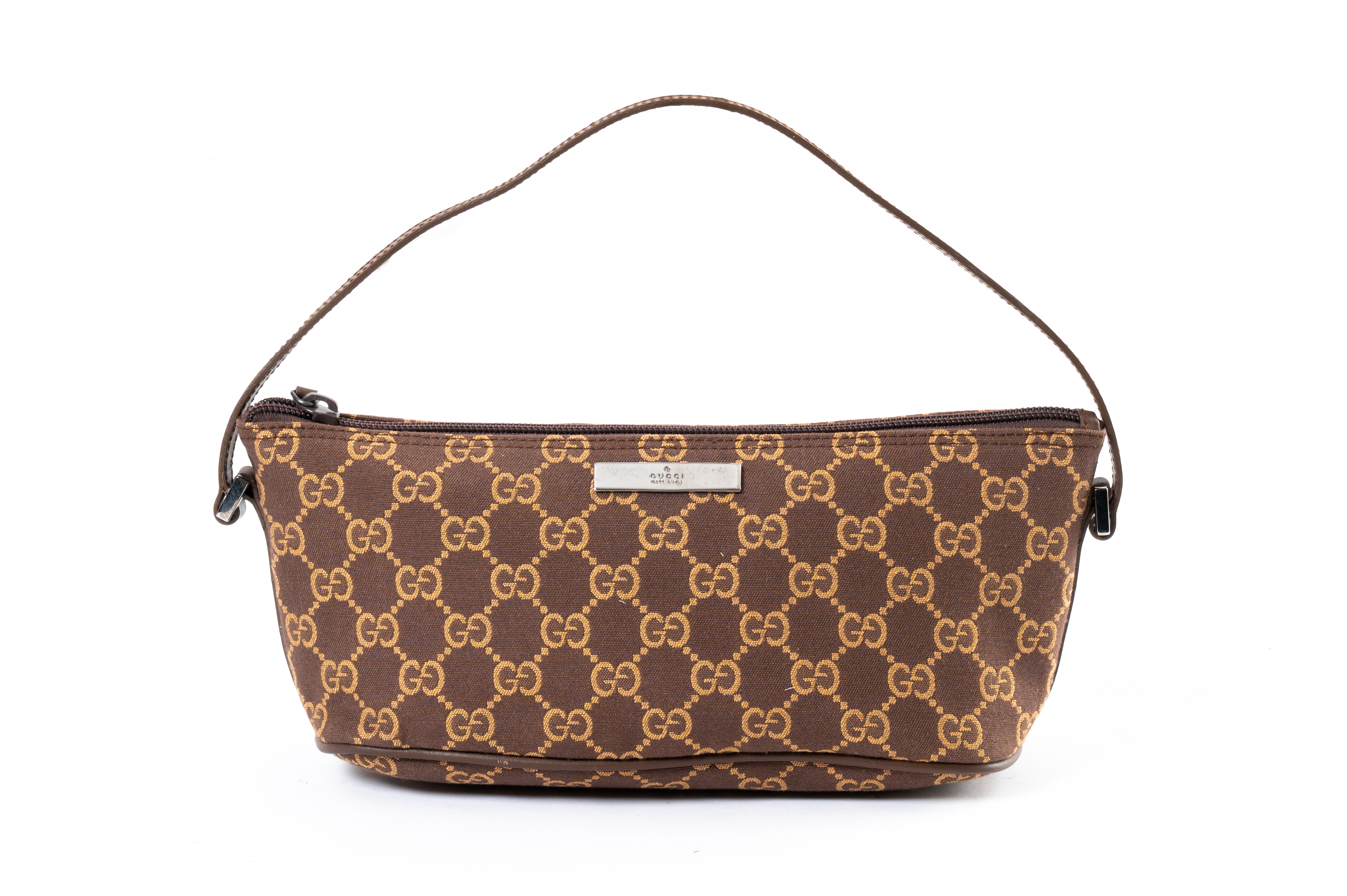 Borsa a spalla modello “GG Boat Pochette” in tela Monogram marrone e rifiniture in pelle, tracolla in pelle piatta e una chiusura con zip nella parte superiore, barra frontale in metallo cromato con marchio. Codice e marchio di produzione.