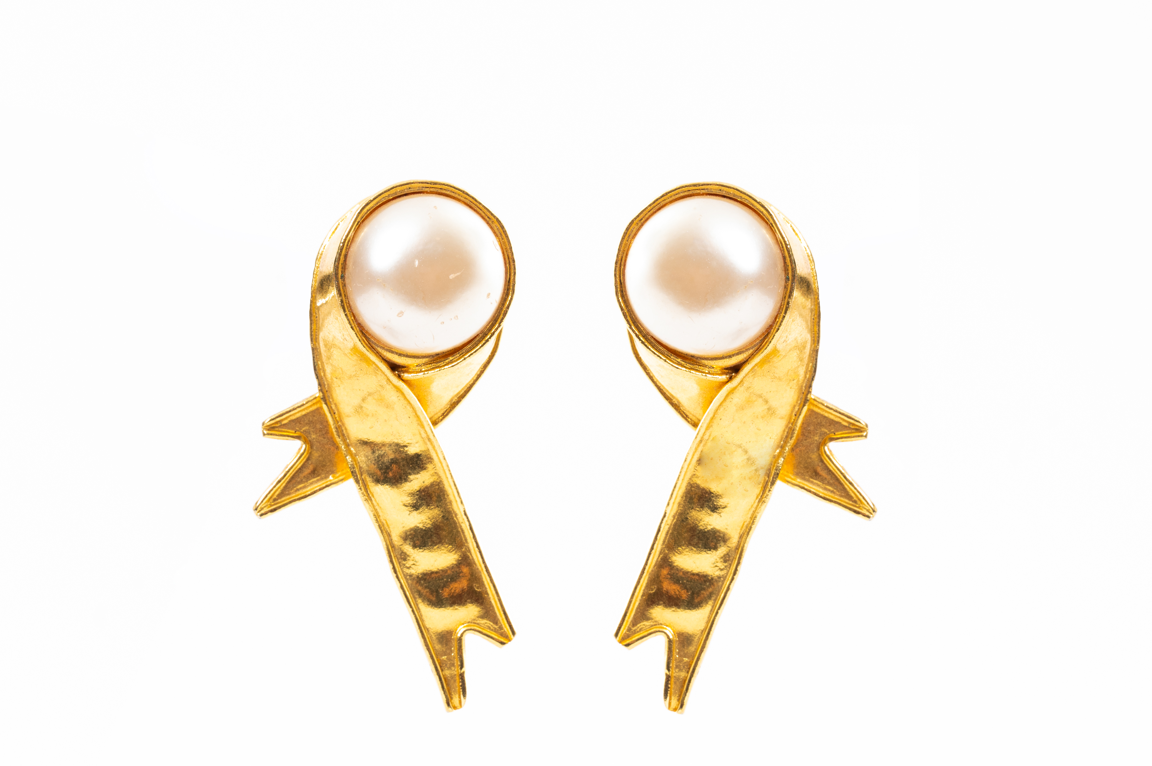 Orecchini con montatura a nastro in metallo dorato, mezza perla, chiusura a clips. Lievi usure. Marchio di produzione.