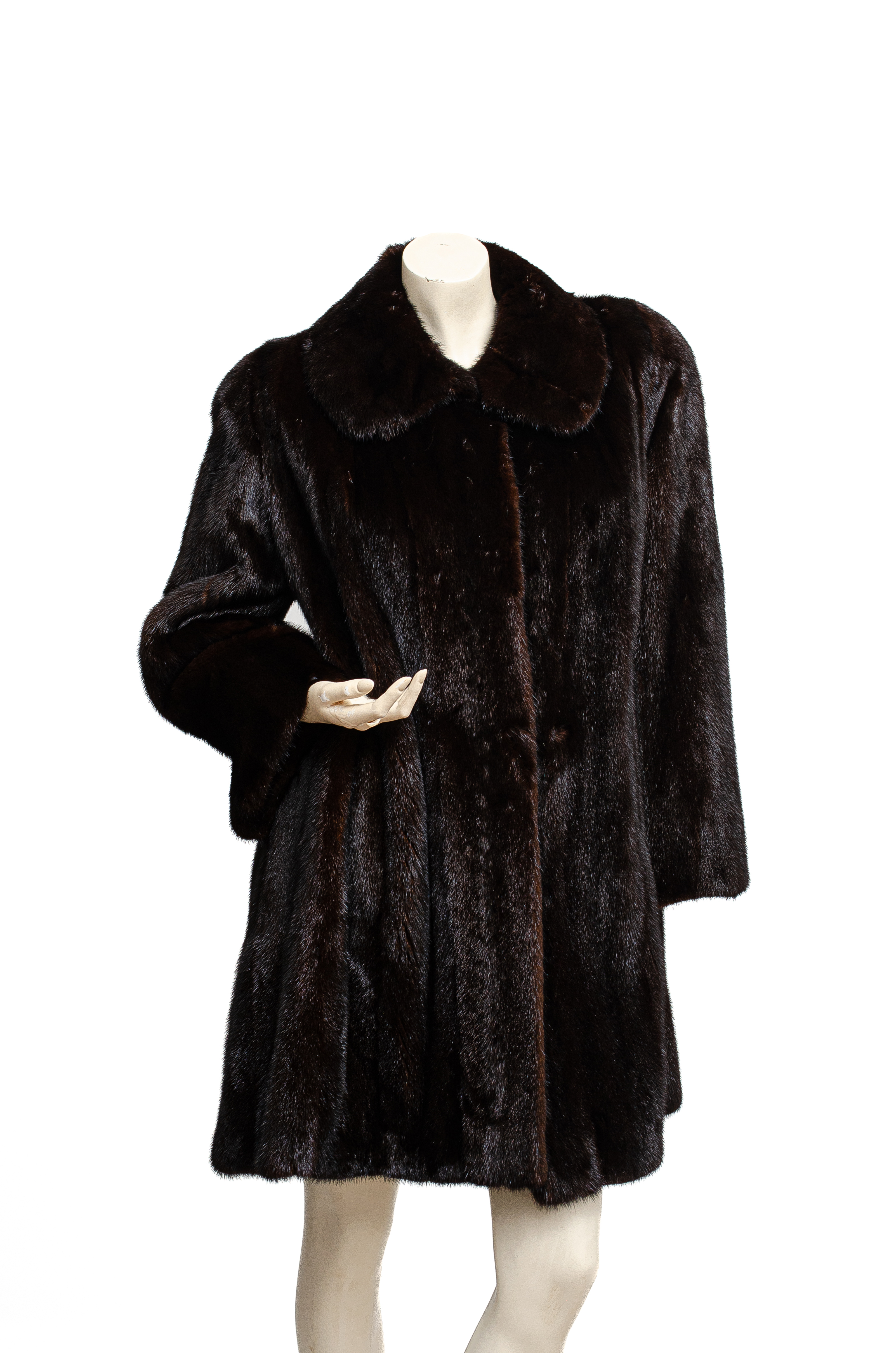 Giacca lunga in pelliccia di visone blackglama, maniche lunghe, due tasche sul fronte, tasca intera, chiusura con ganci, collo con punte arrotondate, fodera interna grigio scuro, monogramma interno L.V. Taglia M.