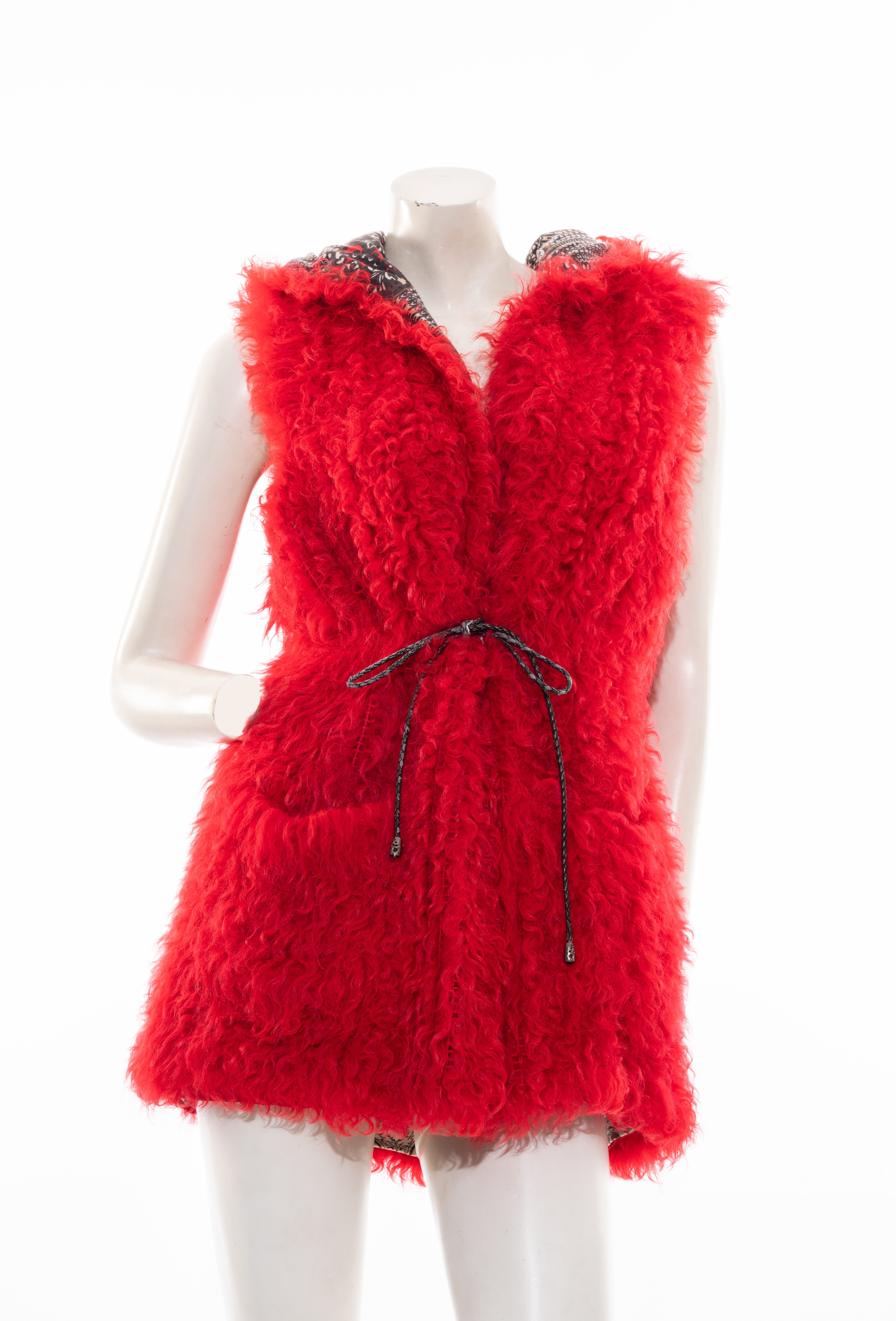 Gilet in pelliccia di Mongolia rossa a lavorazione pelli intere, collo con cappuccio, fodera interna a decoro policromo, tasche a taglio orizzontale sui fianchi, polsi in maglia nera, chiusura frontale con cintura. Taglia M.