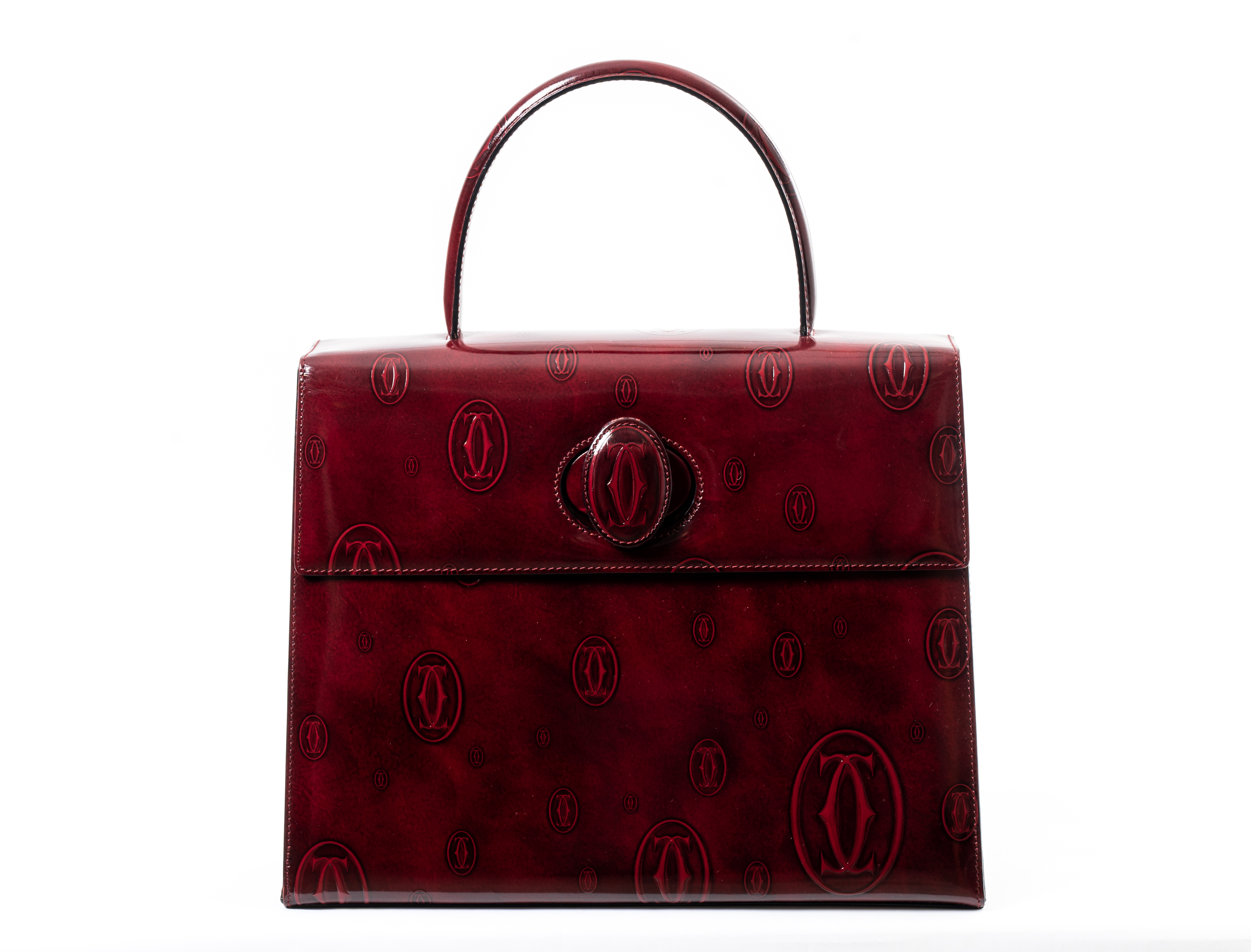 Borsa a mano modello ”Happy Birthday” in vernice Borgogna con loghi Cartier, manico lievemente imbottito, patta frontale con chiusura a torsione, tasche interne con zip e slip. Marchio di produzione.