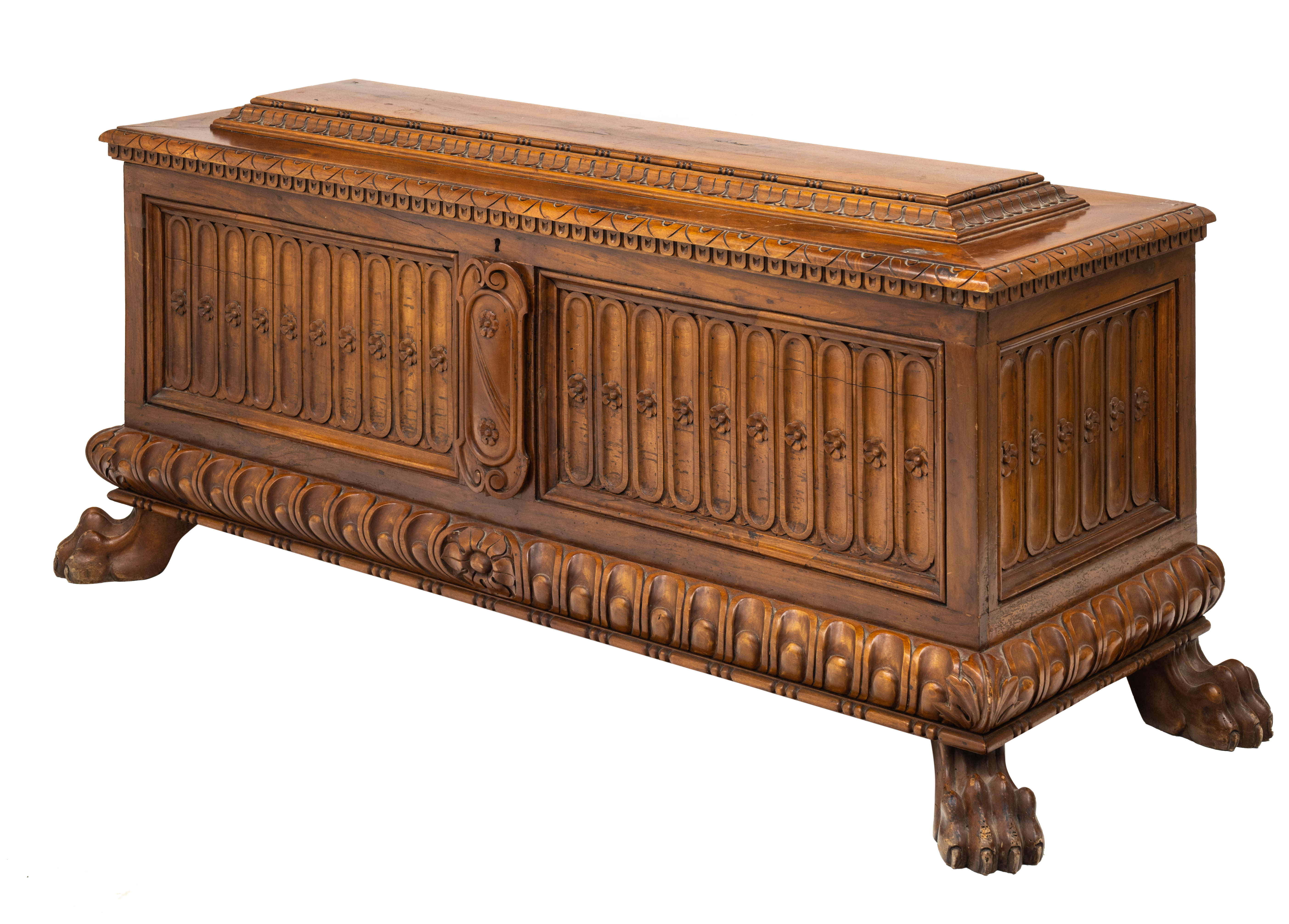 Cassapanca di gusto rinascimentale in legno di noce.