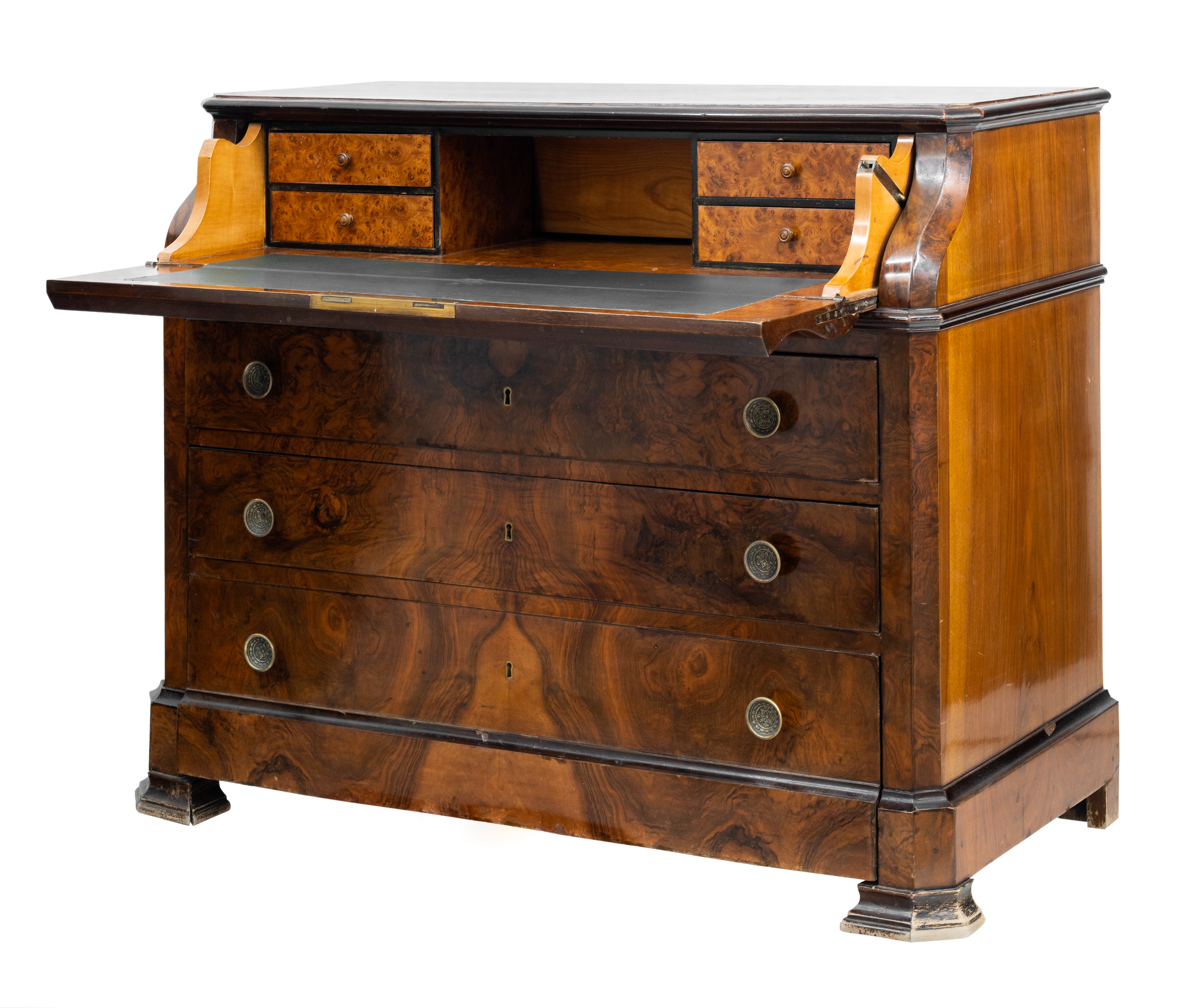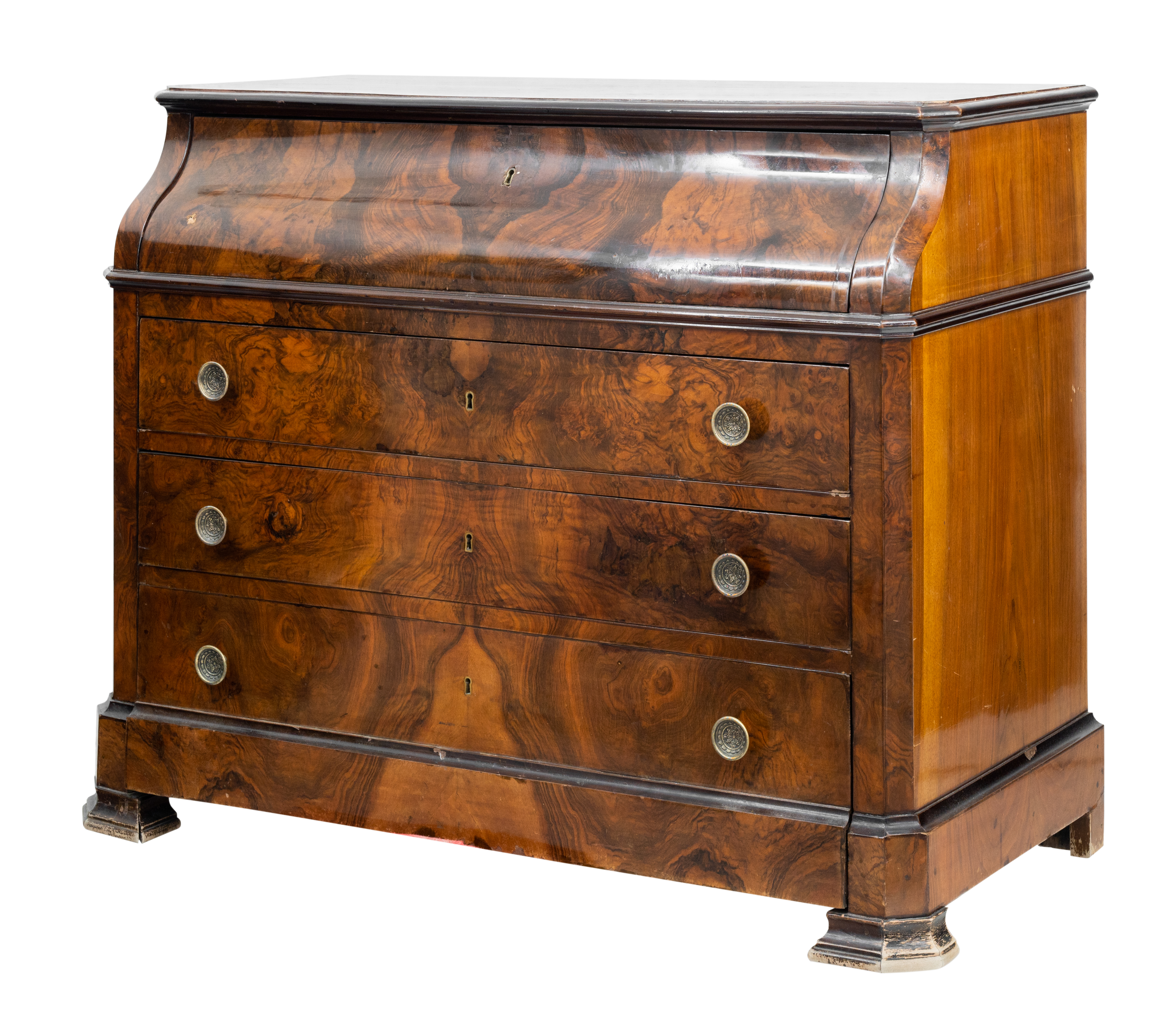 Cassettone in legno di noce e radica di noce, con ribalta e cassettiera interna.