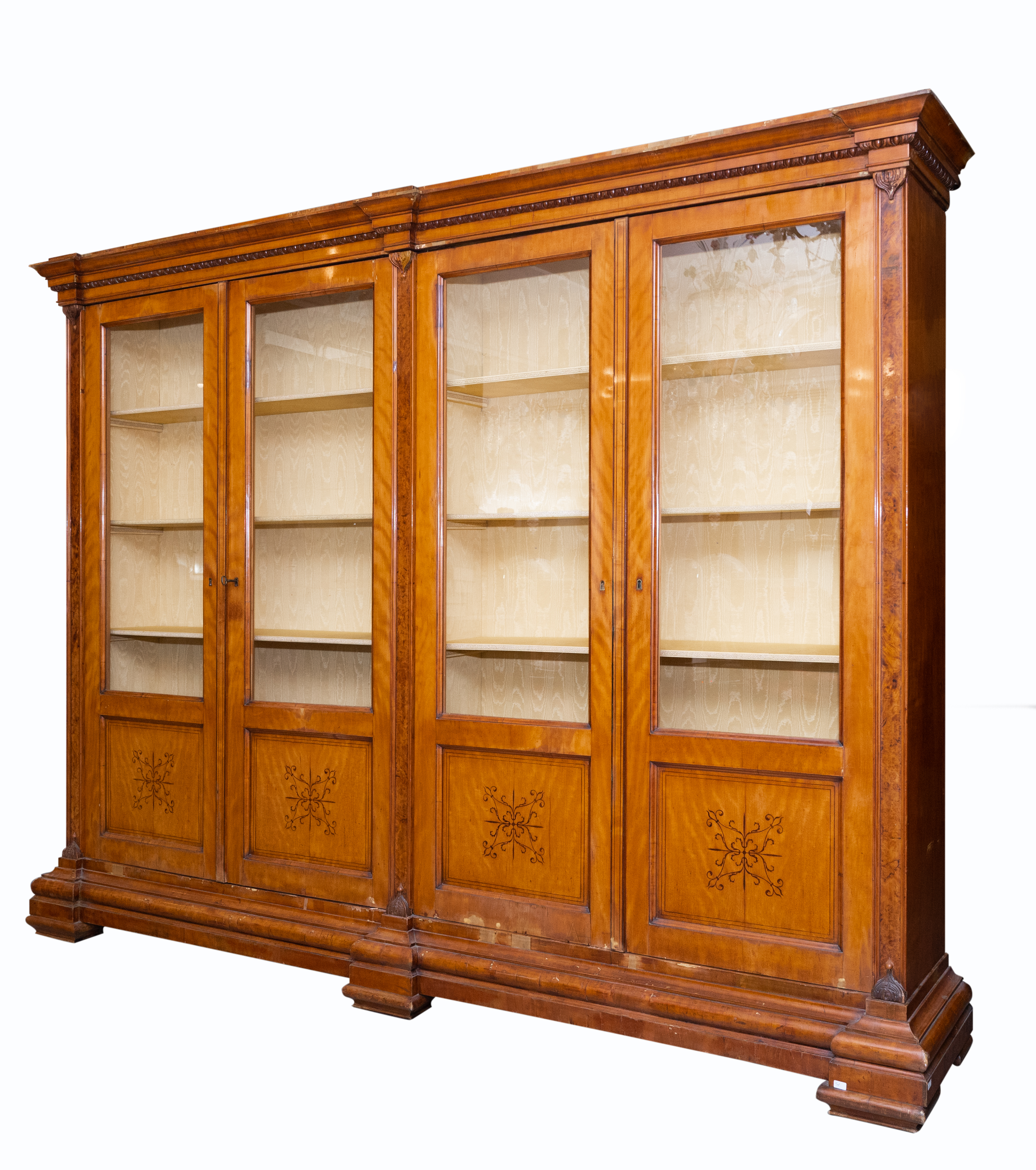 Vetrina/libreria Carlo X a quattro ante in legno acero e radica di tuja con tarsie in bosso.