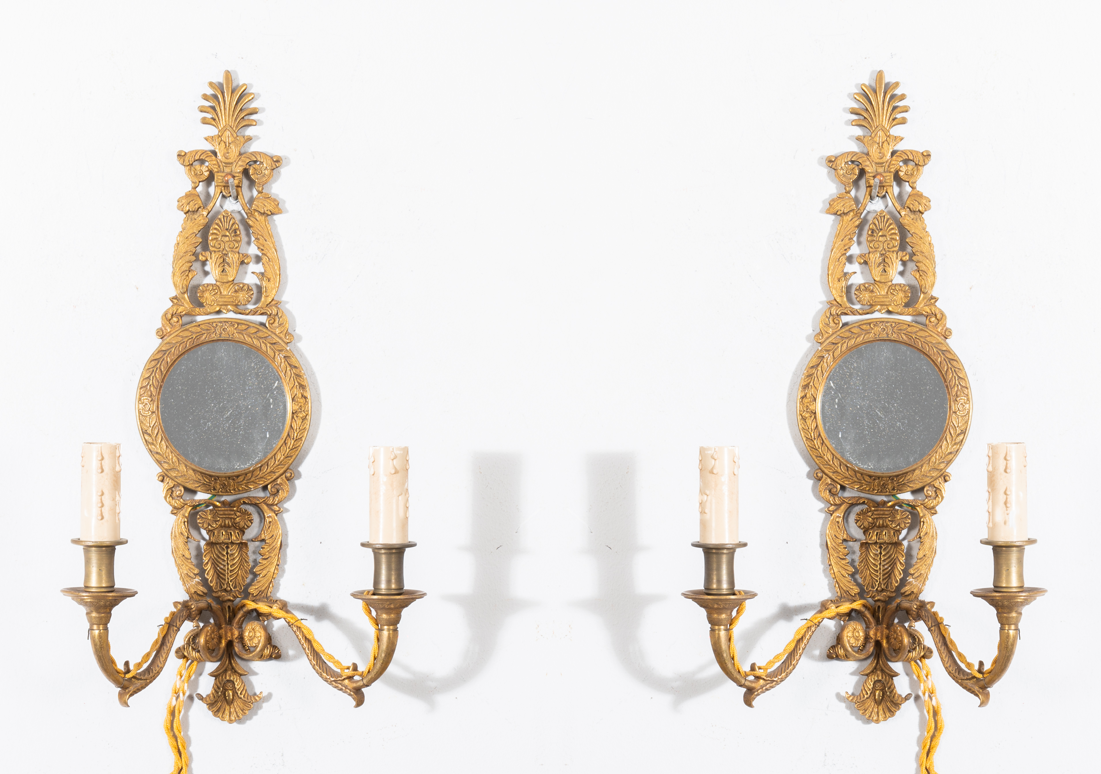 Coppia di applique stile Impero a due luci con piccolo specchio centrale in bronzo dorato.