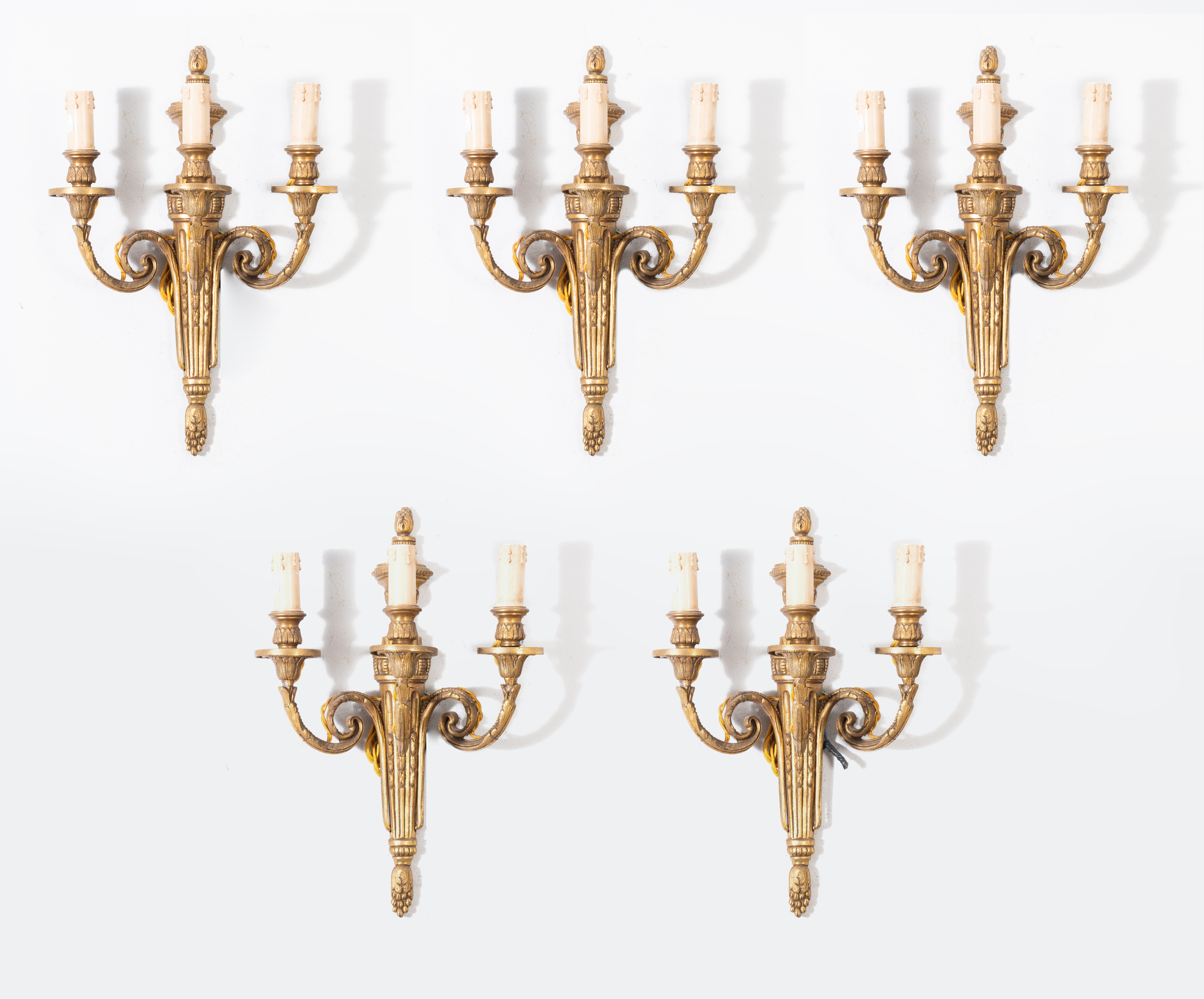 Cinque applique stile Luigi XVI in bronzo dorato.