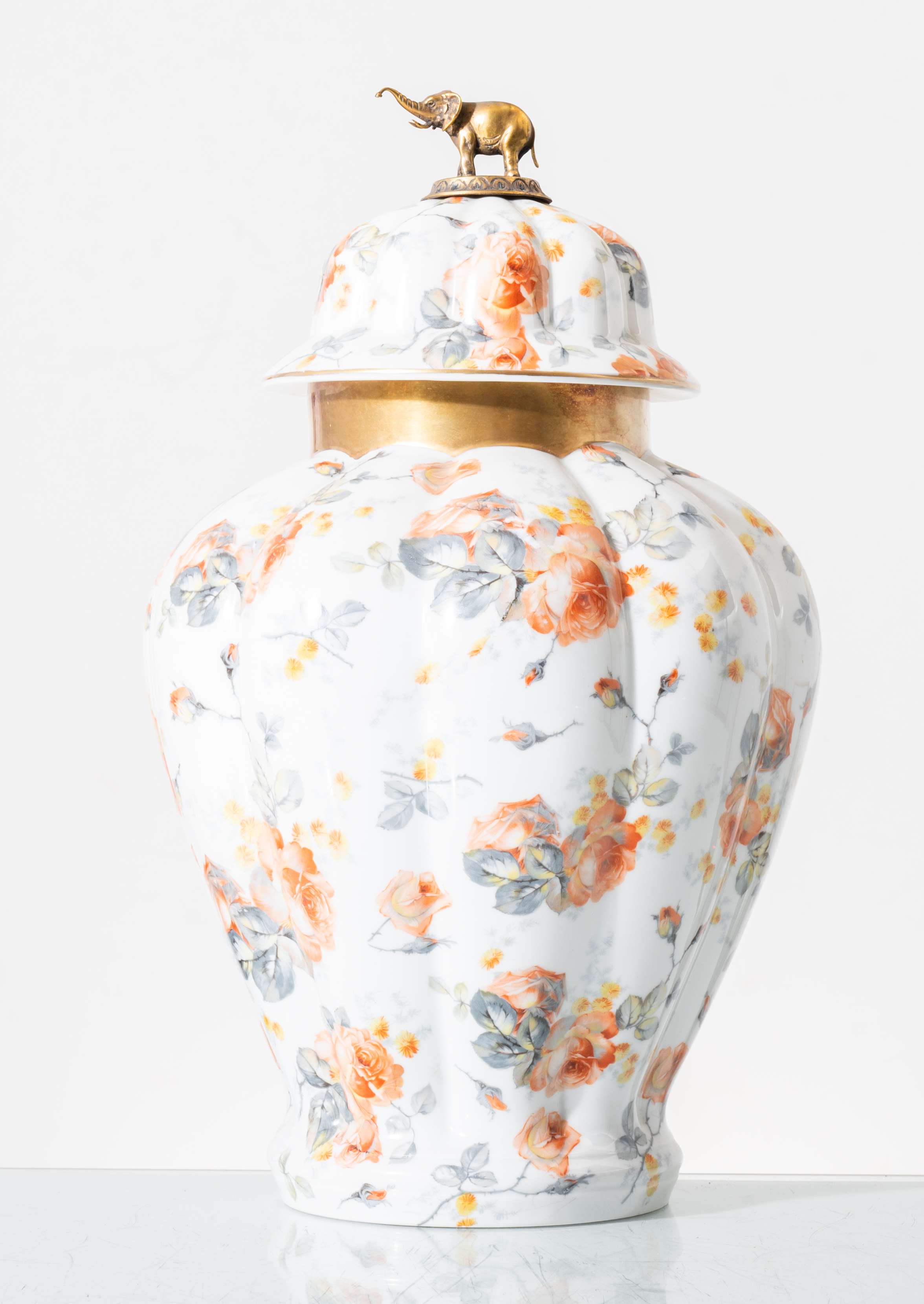 Potiche in porcellana dipinta a mano a motivo floreale, piccola scultura in bronzo raffigurante "Elefante" nella parte superiore.