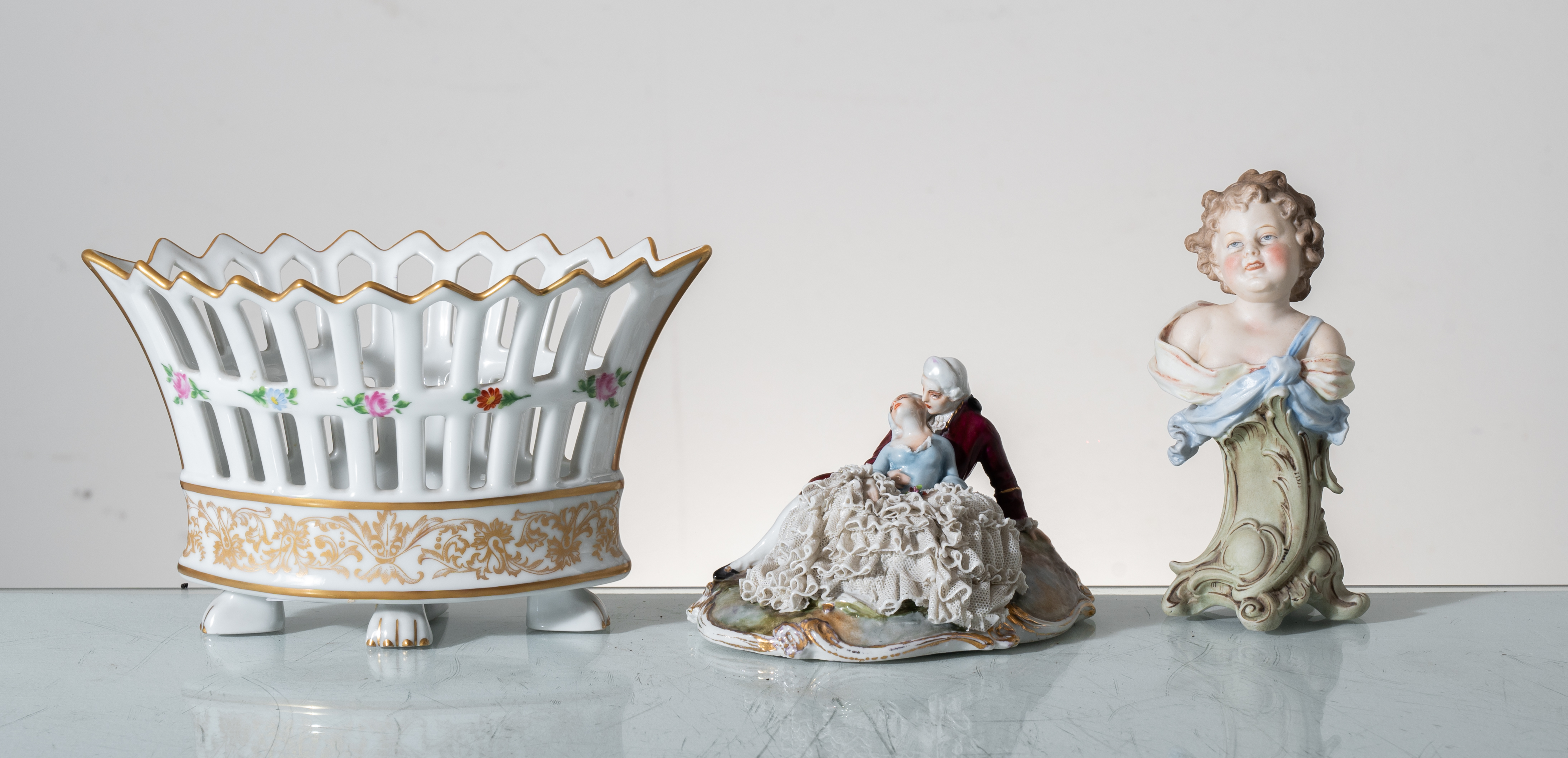 Centrotavola in porcellana dipinta a mano a motivo floreale con lumeggiature in oro, gruppo in ceramica policroma raffigurante "Scena galante" e scultura in biscuit policromo raffigurante "Mezzo busto di Putto".