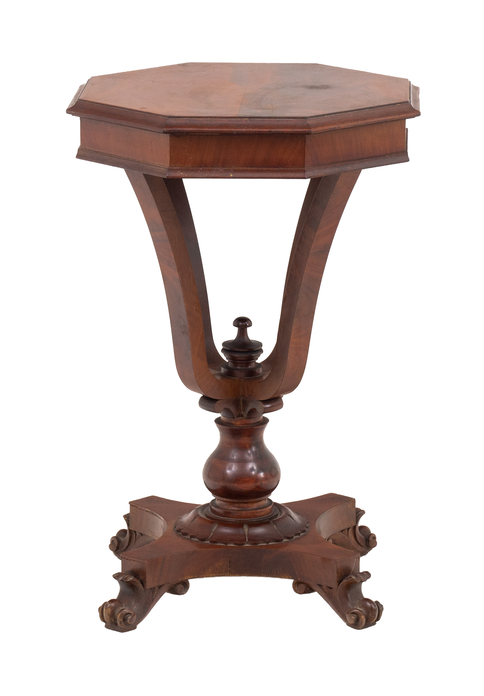 Tavolino di forma ottagonale in legno di mogano e piuma di mogano.