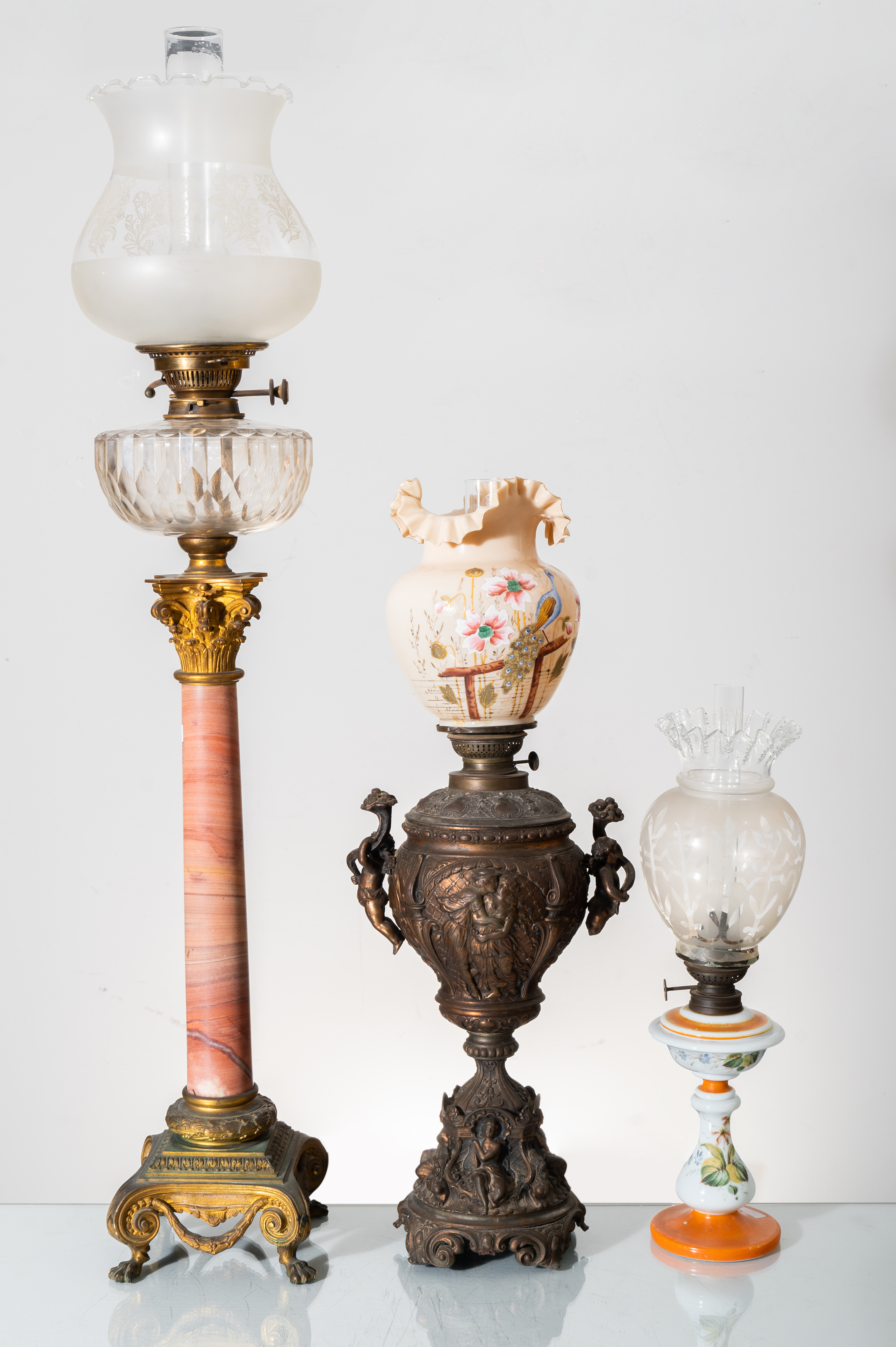 Lume a petrolio in metallo sbalzato, boccia in opaline dipinta; lume in metallo dorato, ottone, con colonna in marmo fossile, parte superiore in cristallo, boccia in vetro incisa ed un lume a petrolio in opaline decorata, boccia in vetro.