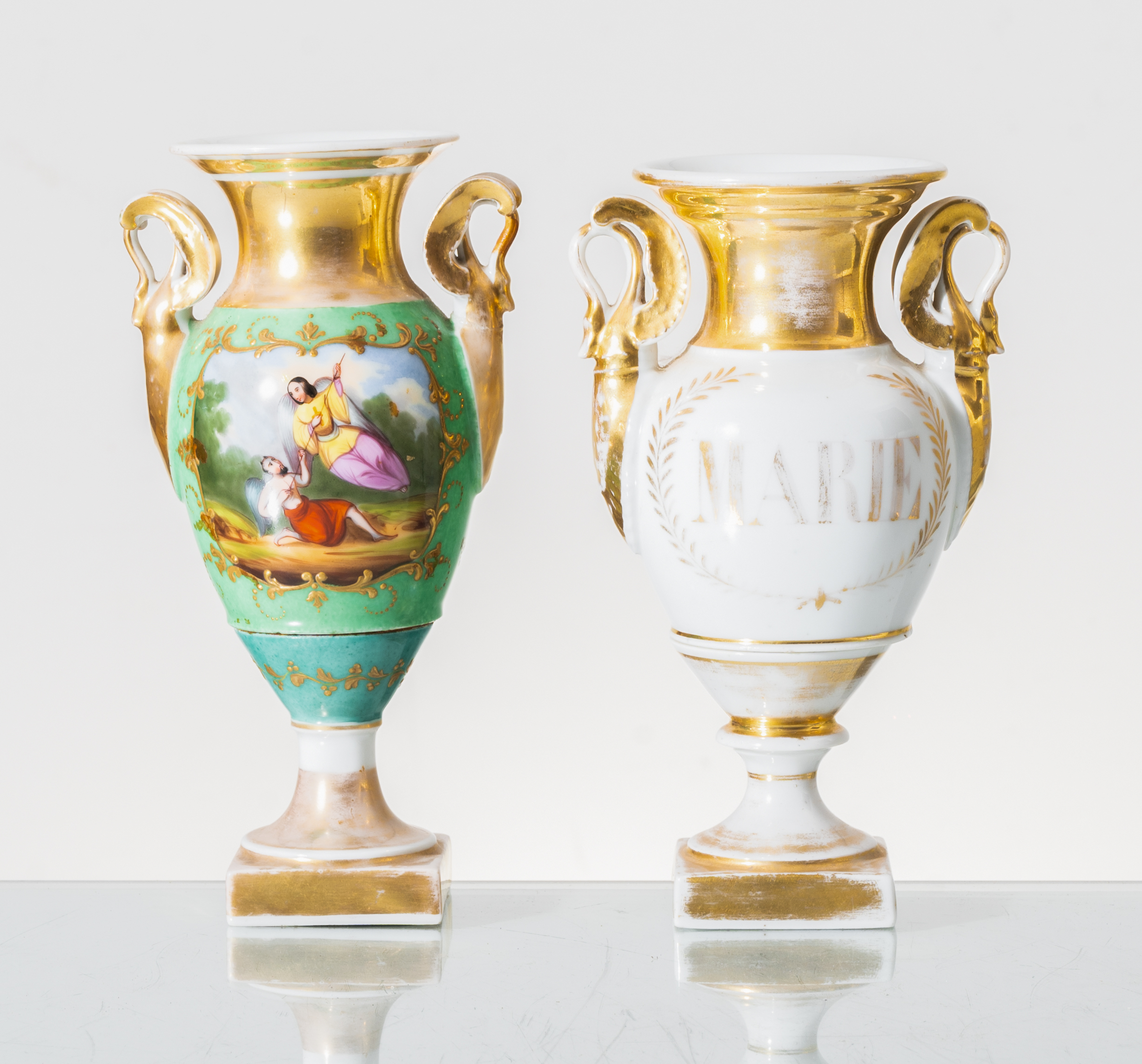 Due vasi Impero in porcellana dipinta e lumeggiata in oro (piccolo filè).