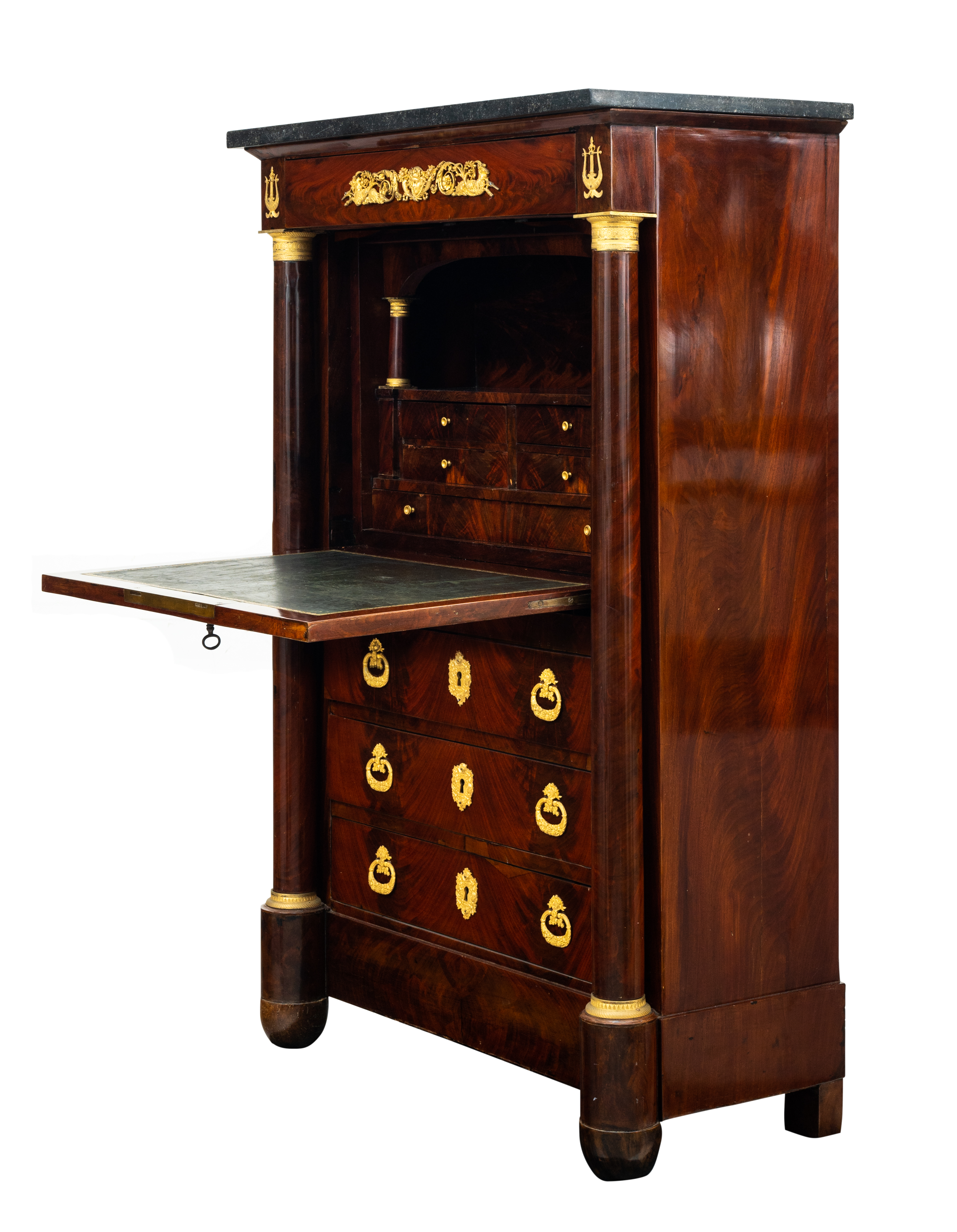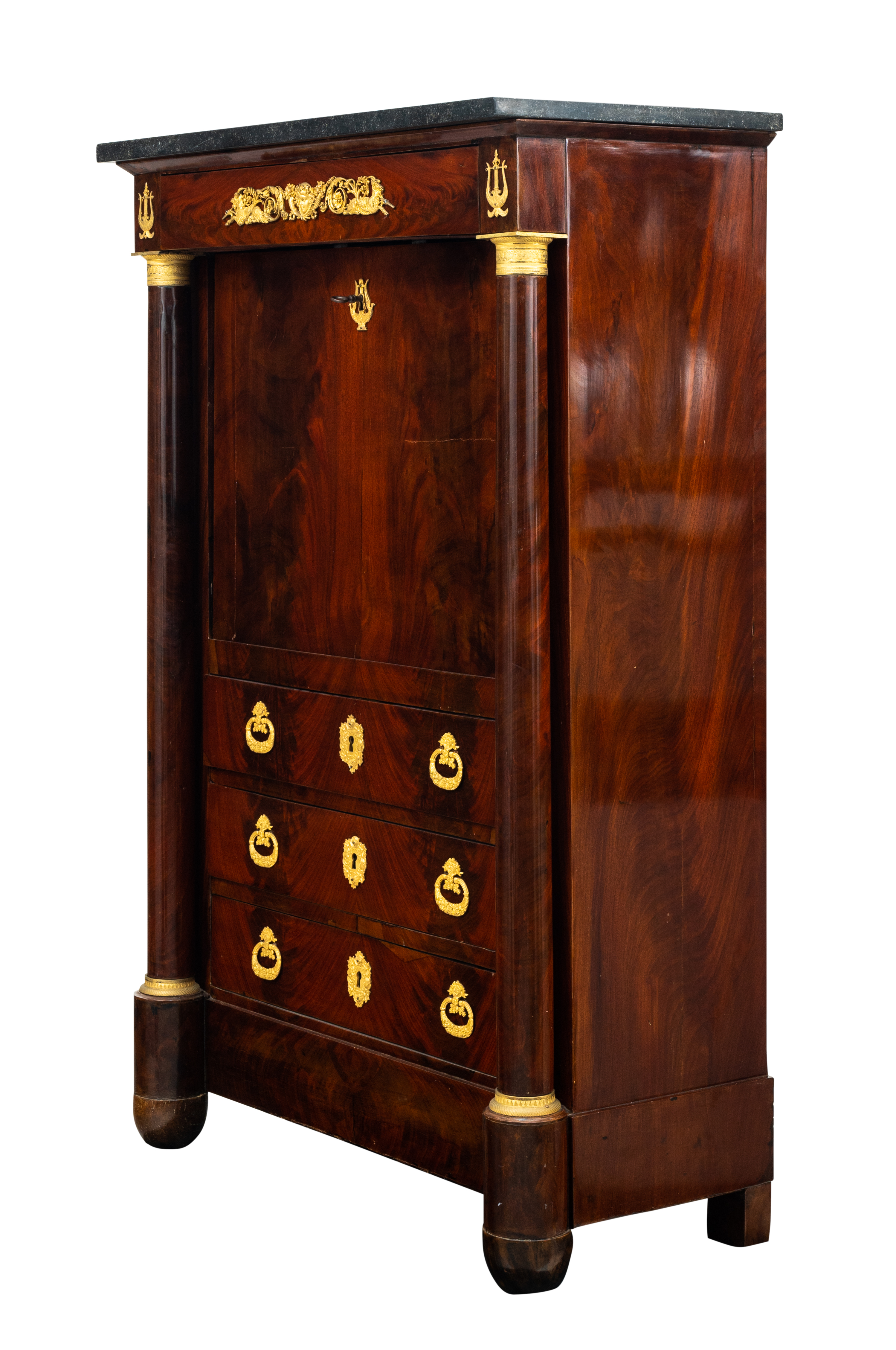 Secretaire Impero con ribalta con all'interno cassettiera e tre cassetti in legno di mogano e piuma di mogano, guarnita da bronzi dorati ad oro zecchino.