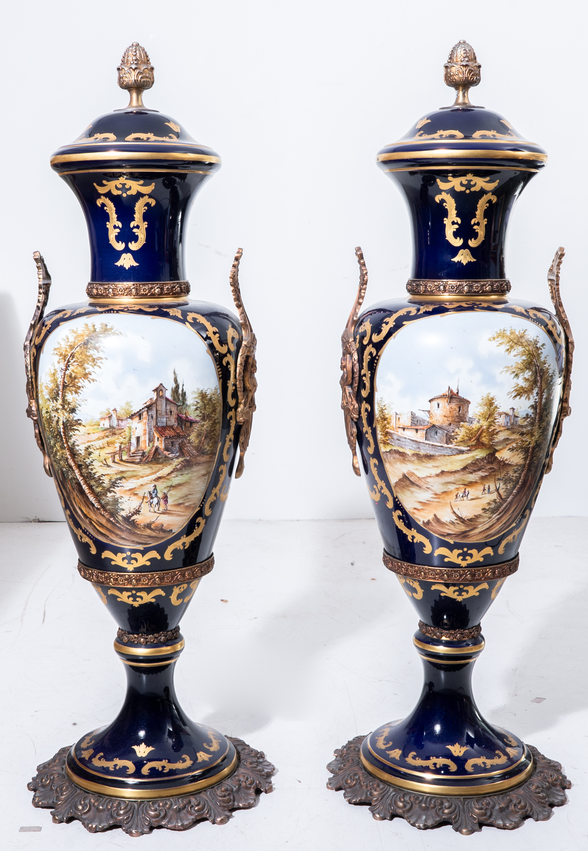 Coppia di grandi potiche in porcellana di Sevres decorati a mano, lumeggiature in oro, basi ed anse in bronzo.