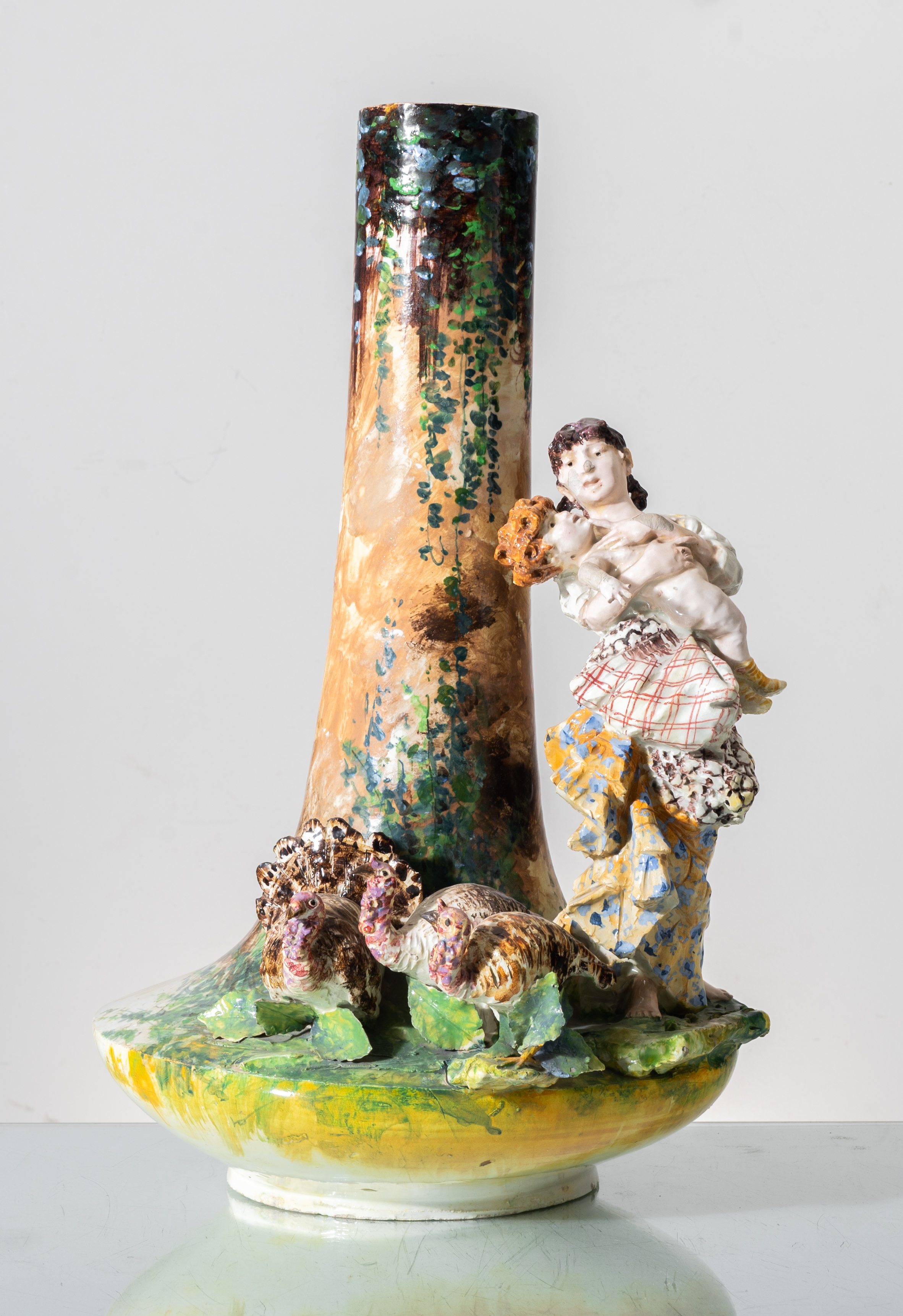 Vaso in ceramica smaltata e decorata con composizione raffigurante "Figura femminile con bambino" (difetti).