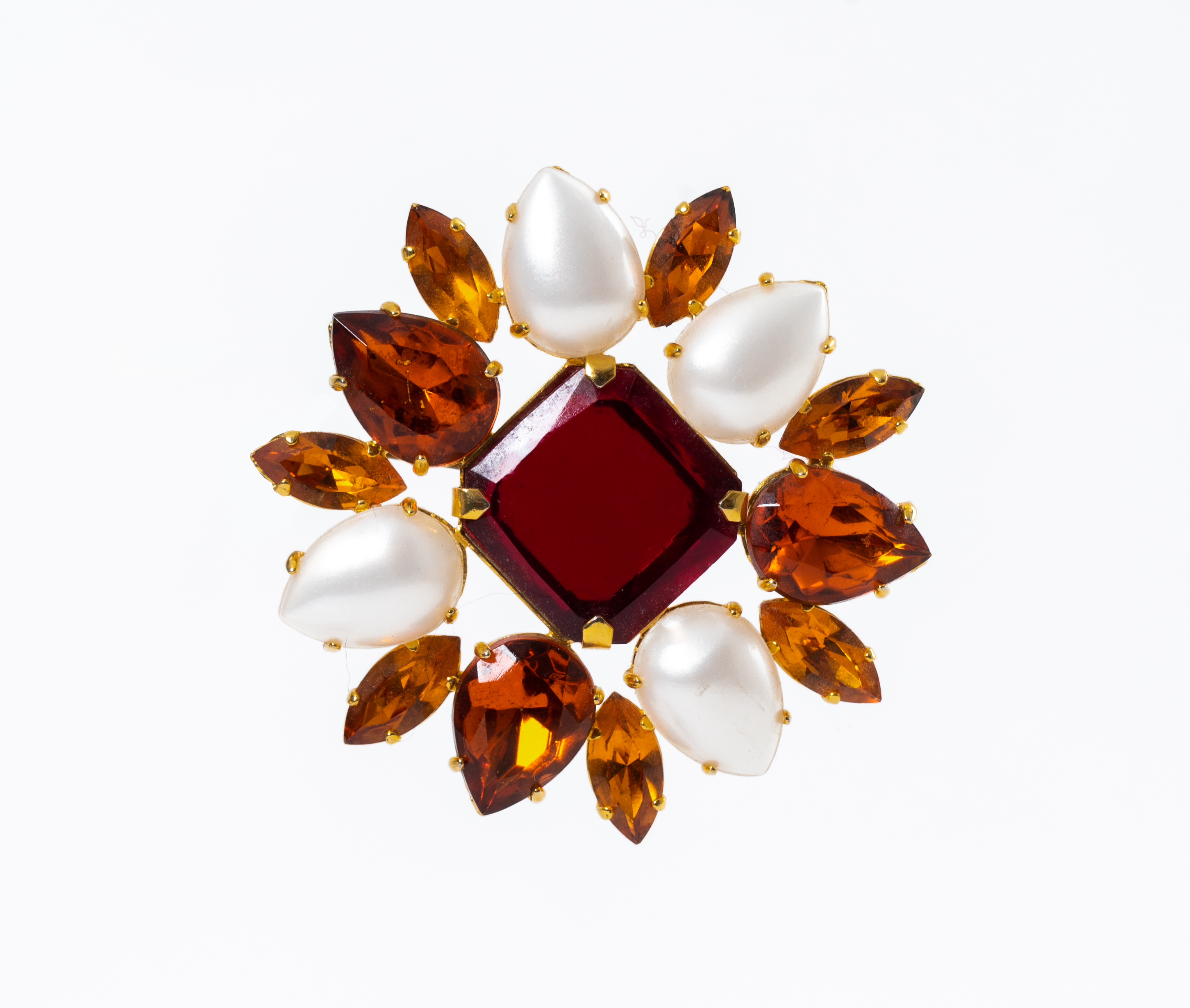 Spilla con montatura in metallo dorato, centrale di taglio quadrato, perle a goccia e pietre sintetiche color topazio.