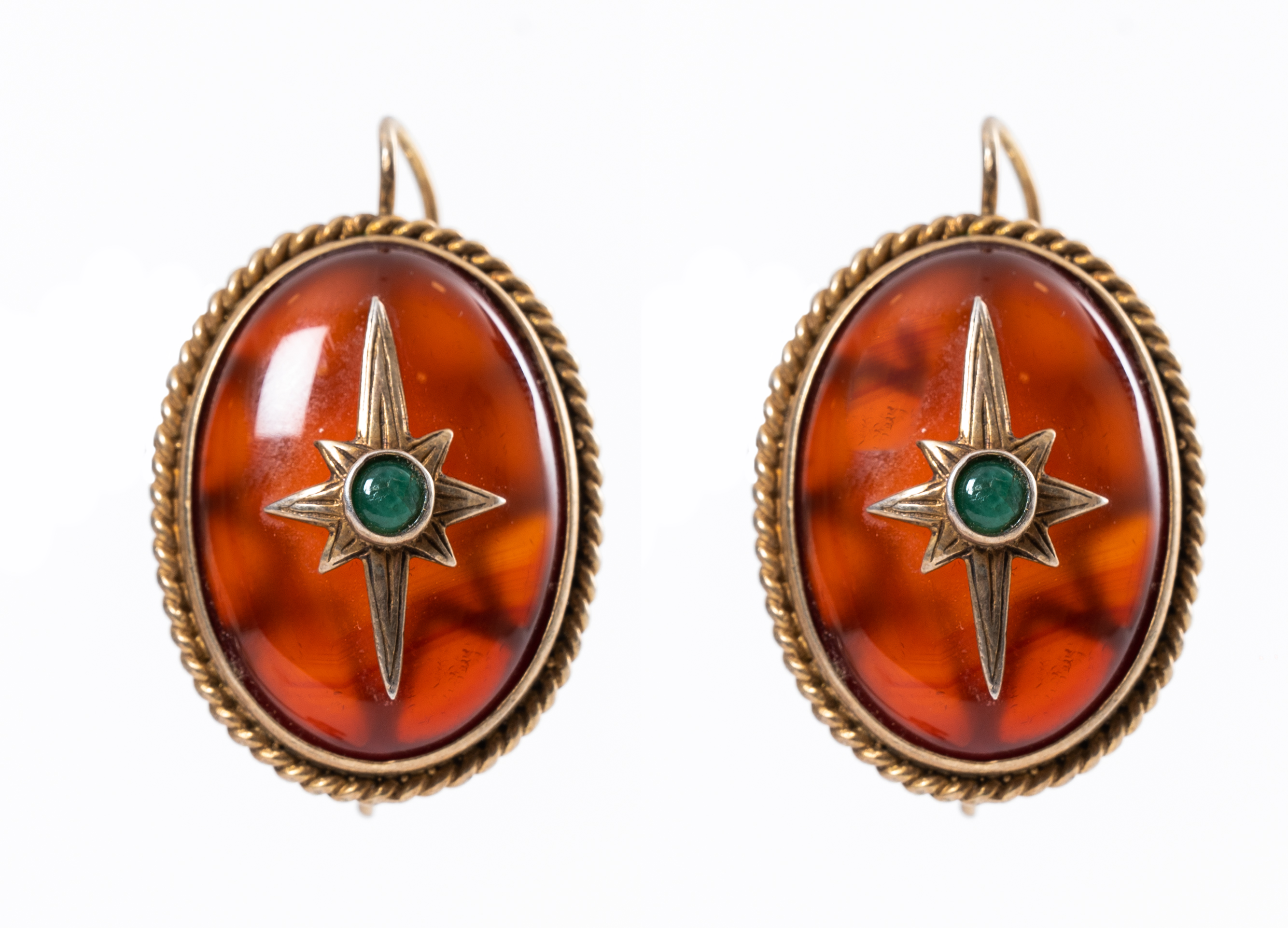 Orecchini con montatura in argento 925 vermeil, cabochon ovale in pietra color ambra con pietra verde incassata, chiusura a gancio. Punzone.