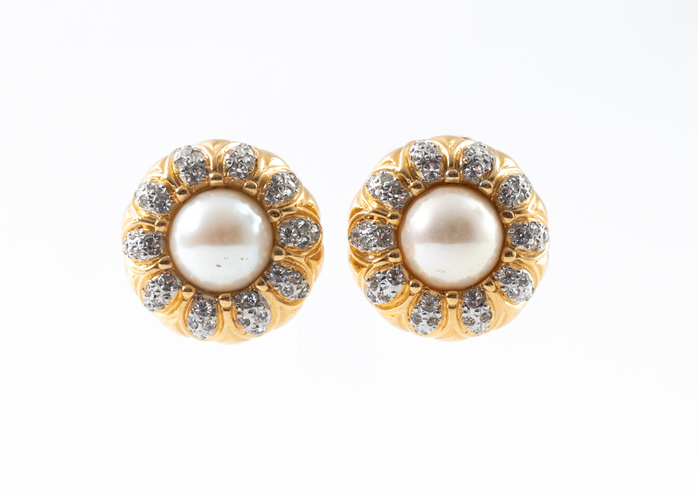 Orecchini a bottone con montatura in metallo dorato con lavorazione a petali in diamanti sintetici, mezza perla centrale, chiusura a clips.