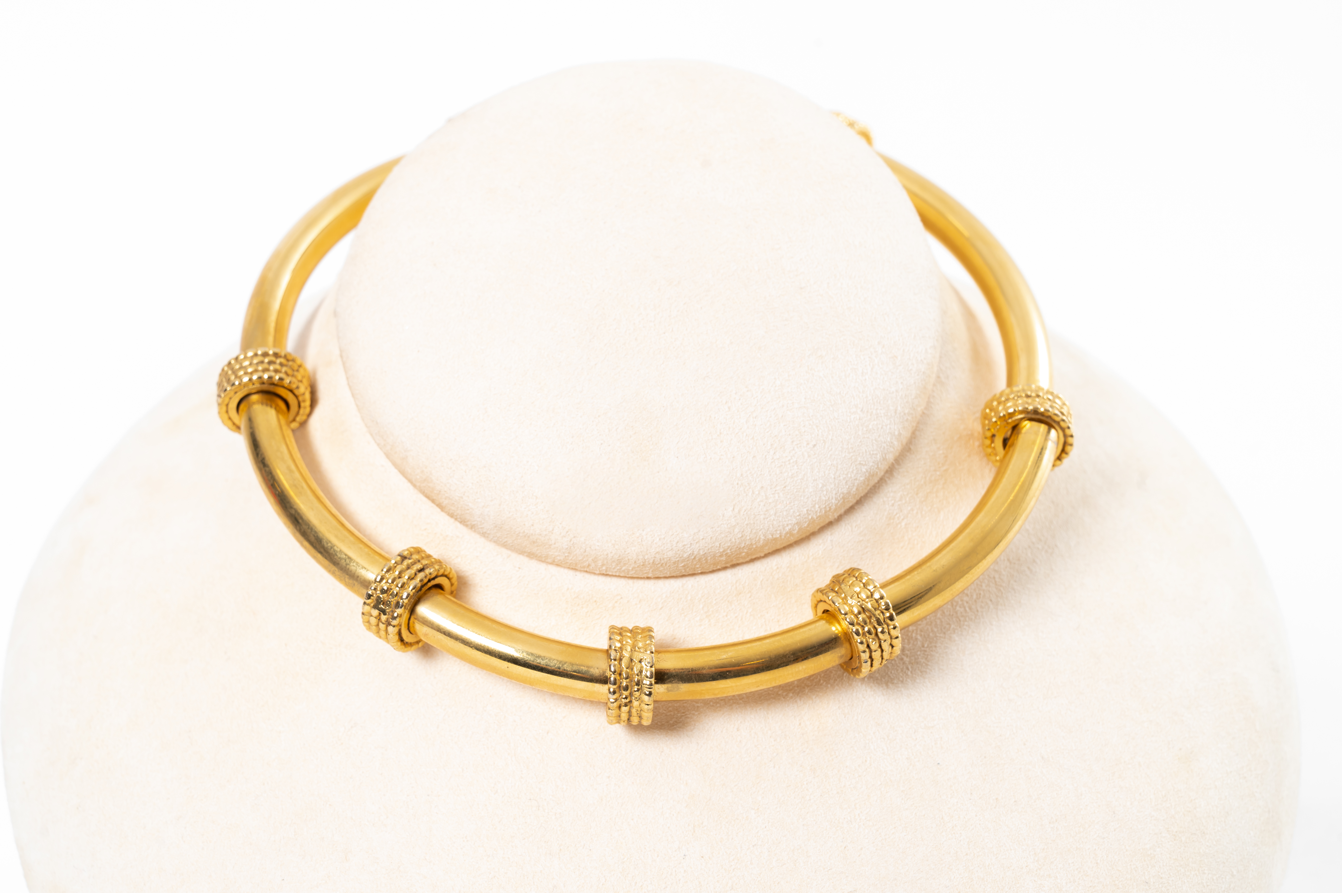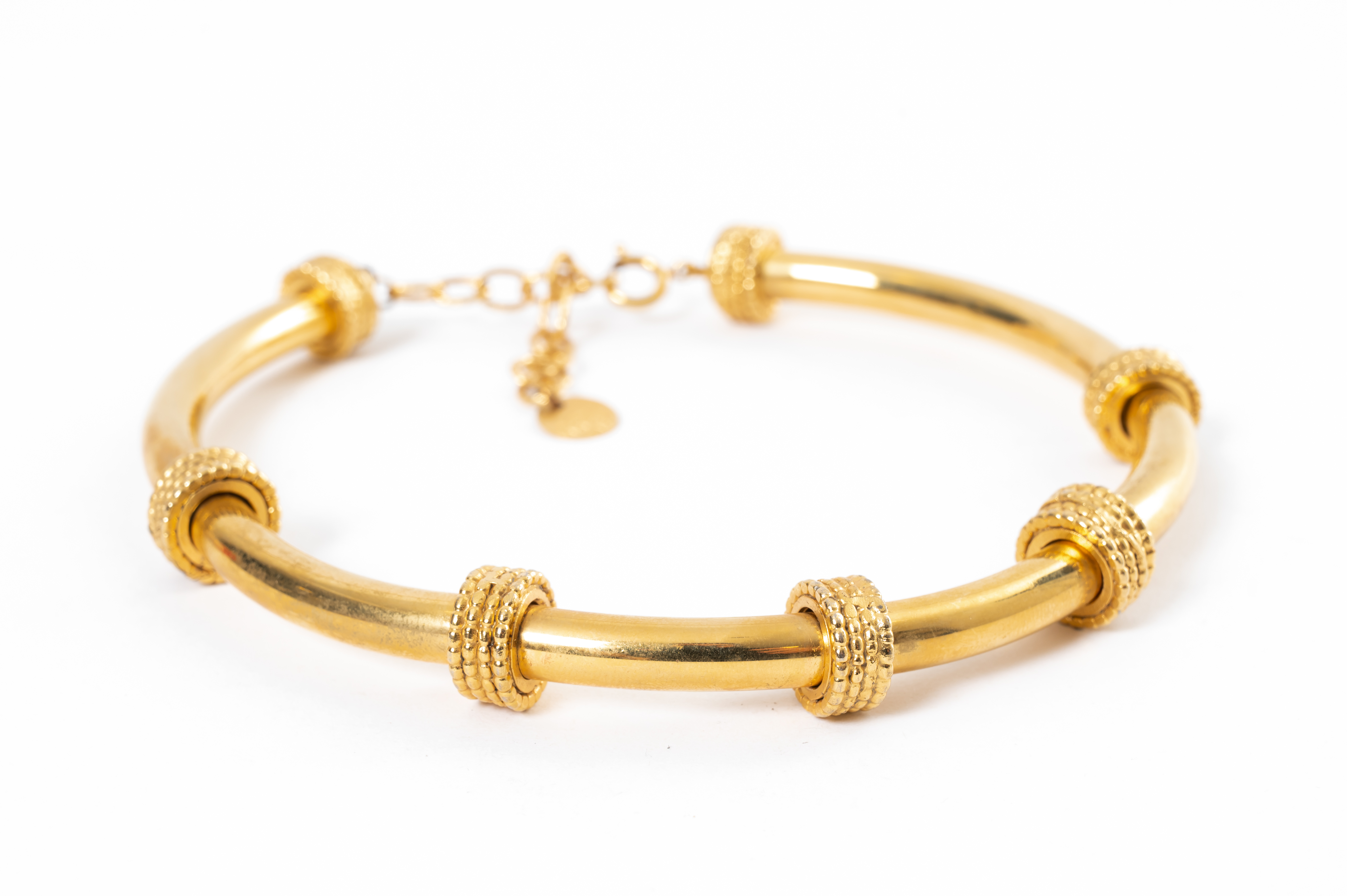 Girocollo semirigido con montatura in metallo dorato composto da elementi tubolari flessibili e congiunti da elementi circolari battuti, chiusura con catena e moschettone. Marchio di produzione.
