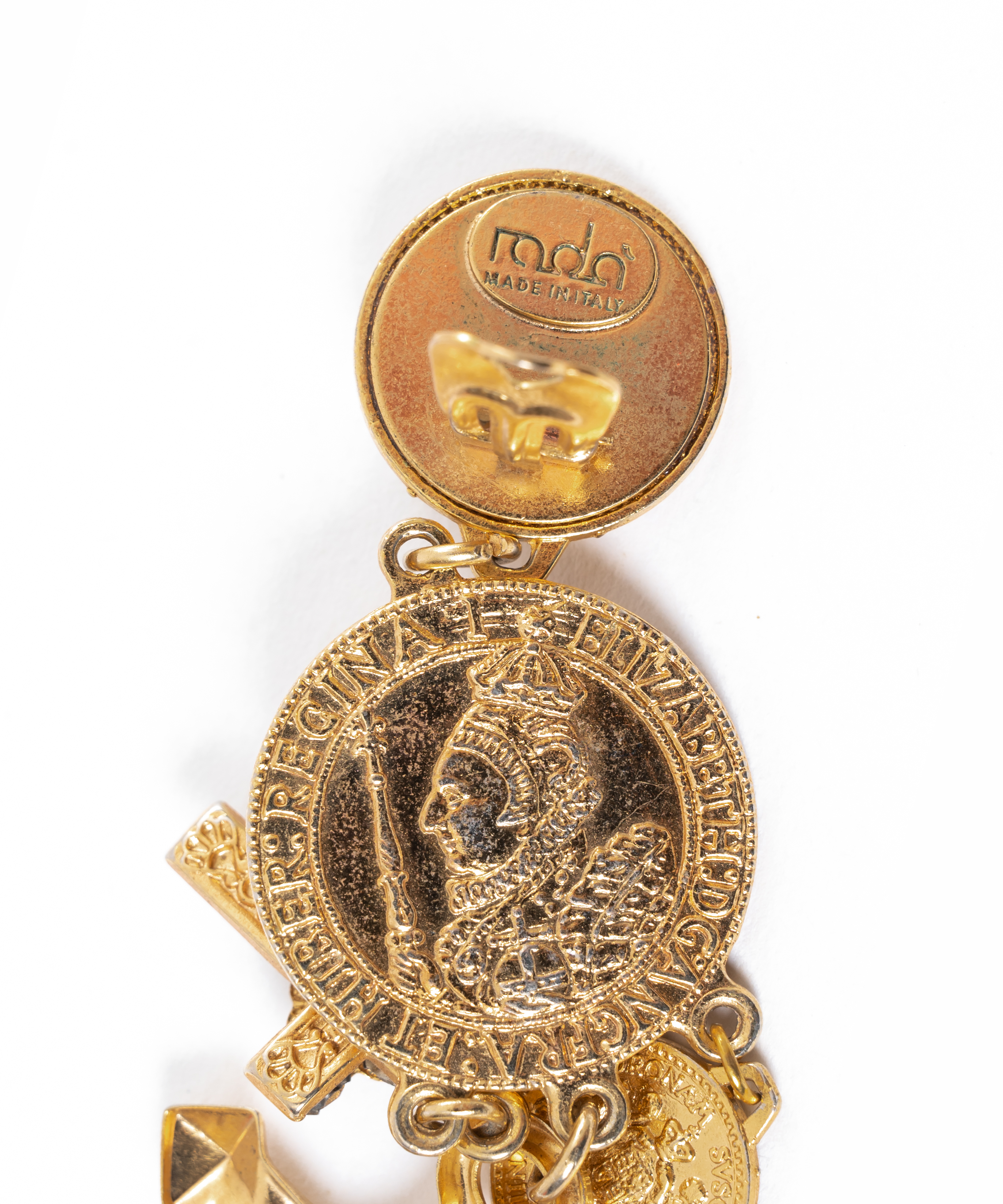 Orecchini pendenti con chiusura a clips, montatura in metallo dorato con monete e croci, diamanti sintetici, micro perle, uno stiletto. Marchio di produzione.