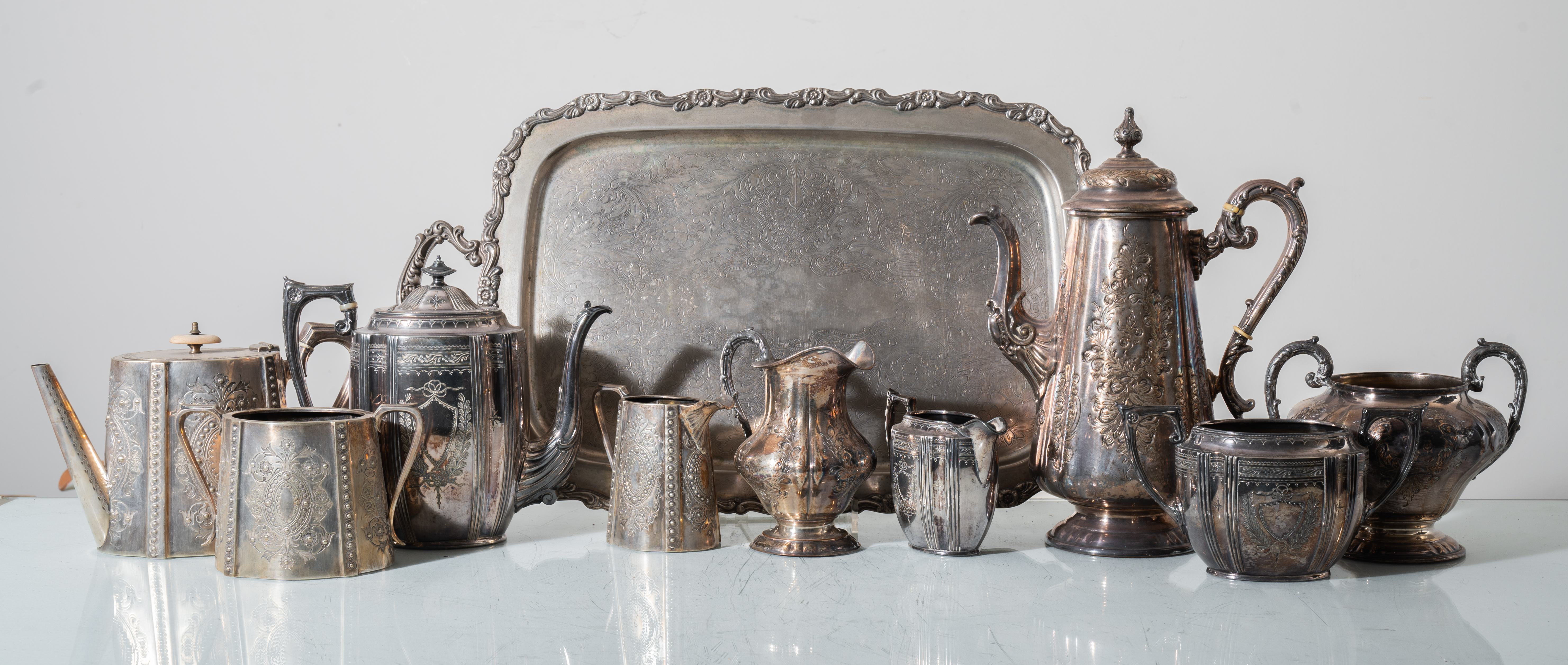 Tre teiere, tre lattiere, tre zuccheriere ed un vassoio in sheffield.