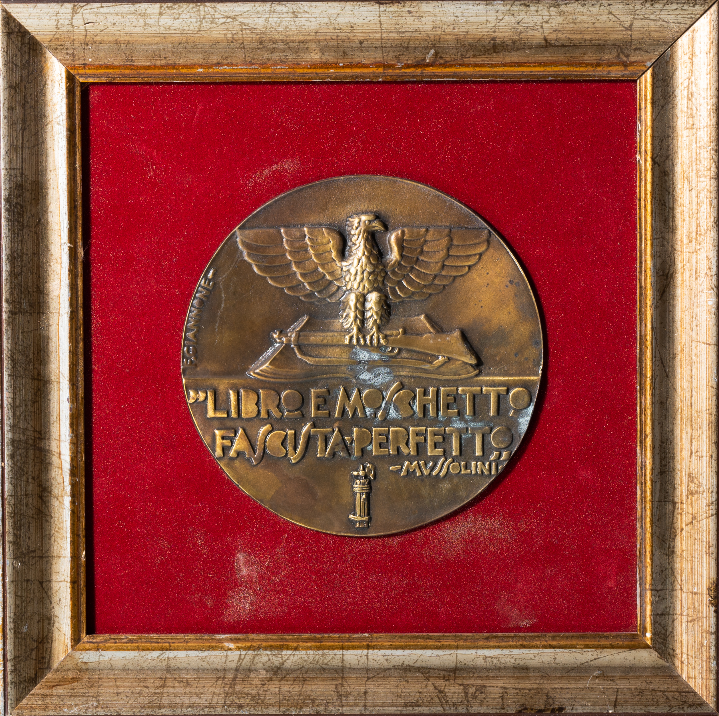 Medaglia di epoca fascista firmata Francesco Giannone "Libro e moschetto Fascista perfetto".