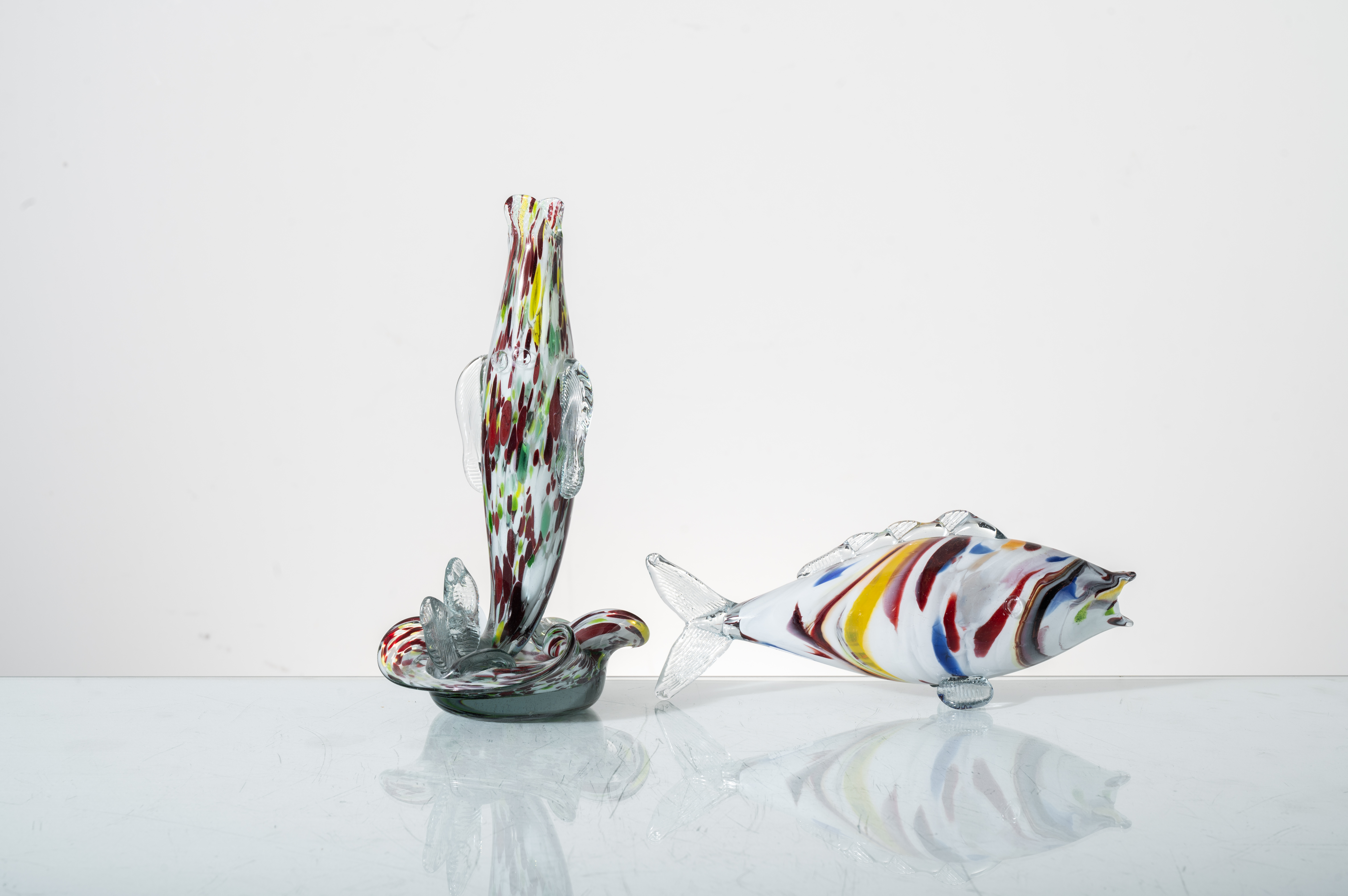 Due sculture in vetro di Murano raffiguranti "Pesci".